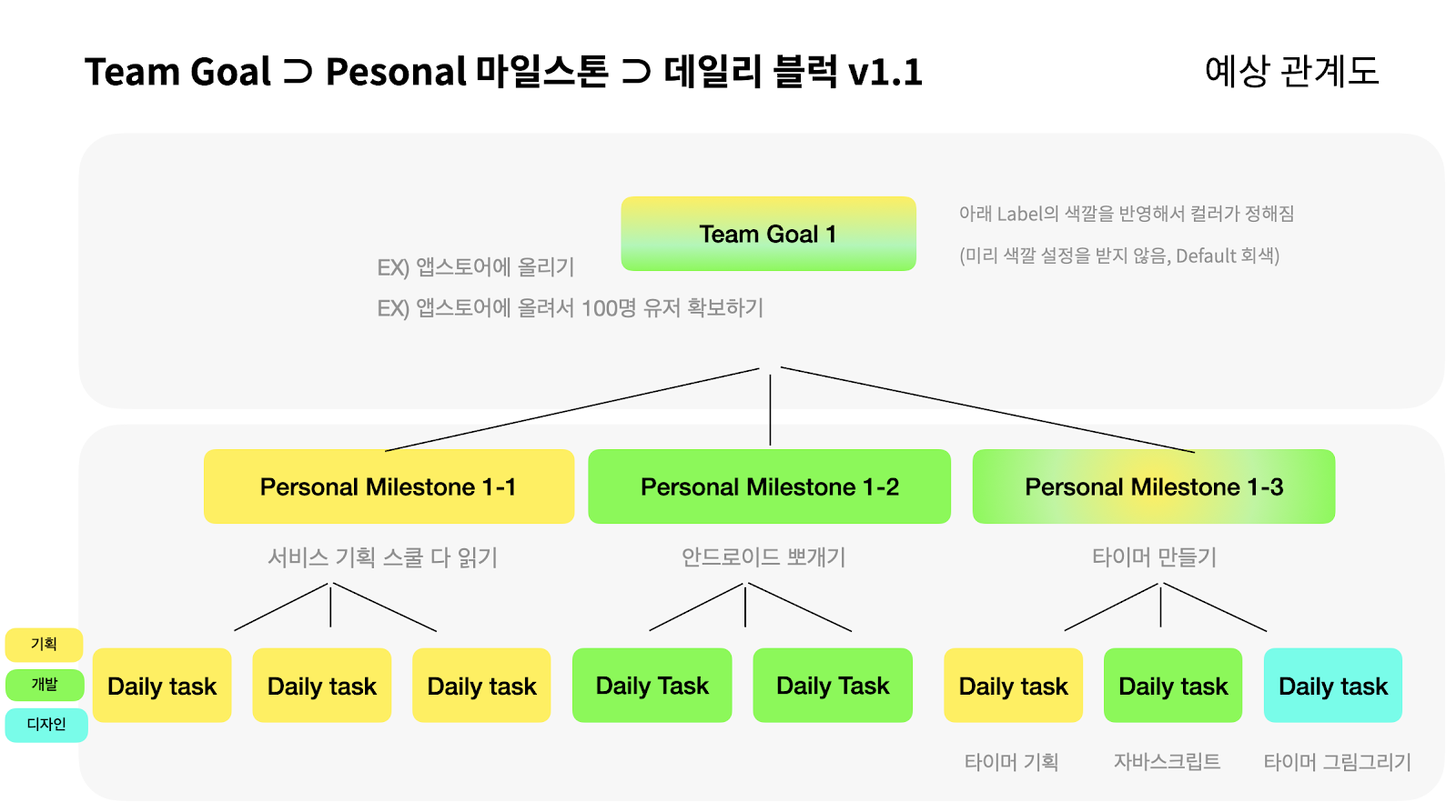 ํญํด์ผ์ง์ ์ ์ฅํ๋ฉด, ํ ๋ชฉํ๋ฅผ ์ค์ ํ๊ณ , ํด๋น ํ ๋ชฉํ๋ฅผ ๋ฌ์ฑํ๊ธฐ ์ํด ๊ฐ์ธ์ด ๊ฐ์์ ์์ค๊ณผ ๋๋ฉ์ธ์ ๋ฐ๋ผ ์ ํฉํ Personal Milestone์ ๊ฐ๋ณ์ ์ผ๋ก ํ์ฑํ๋ค. ์ดํ, ํ์๋ค์ ์์ ์ Daily Task๋ฅผ ๋งค์ผ๋งค์ผ์ ๋ธ๋ญ์ ์์ฑํ๋ฉฐ, ๋ง์ผ์คํค์ ๋ฌ์ฑํ๊ณ , ํ Goal์ ๋ฌ์ฑํด๋๊ฐ๋ ๋ฐฉํฅ์ด๋ค. ๋ธ๋ญ๊ณผ ๋ง์ผ์คํค๊ณผ ํ ๊ณจ์ด ์ฒด๊ณ์ ์ธ ์๊ณ ๋ฆฌ์ฆ ๊ด๊ณ๋ก ํ์ฑ๋์ด์์ง๋ ์์ง๋ง, ์ผ์ข ์ ํด๋ ์ ํ์ผ์ฒ๋ผ ๊ฐ๋ ์ ์ธ ํฌํจ๊ด๊ณ๋ฅผ ์ด๋ฃจ๊ณ ์๋ค.