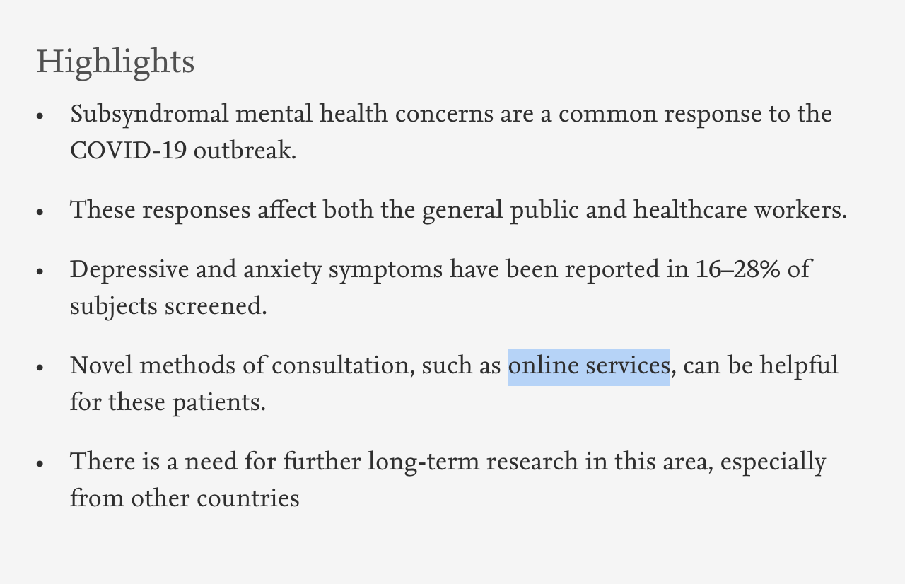 β μ¨λΌμΈ μ¬λ¦¬μλ΄ μλΉμ€(μ: μμ± κΈ°λ° μμ)λ μ€κ΅ λ³Έν 31κ° μ±Β·μκ΅°Β·μμΉκ΅¬ μ μ§μμ κ±Έμ³ μλ£κΈ°κ΄Β·λνΒ·ννμ μ μ 건κ°μ λ¬Έκ°λ€μ΄ νλκ² κ΅¬μΆν΄ 24μκ° λ¬΄λ£ μλΉμ€λ₯Ό μ 곡νκ³ μλ€. μ°μΈμ¦, λΆμ, λΆλ©΄μ¦μ λν μ¨λΌμΈ μΈμ§νλμΉλ£(μ: μμ±) λ± μ¨λΌμΈ μ¬λ¦¬ μμ‘° κ°μ μμ€ν λ κ°λ°λλ€.