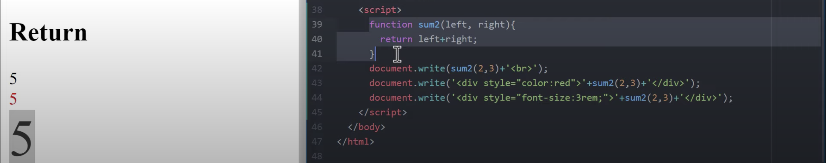 ์ด๋ฐ ๋ฐฉ์์ผ๋ก, ์ ์ฒด๋ฅผ document,wirte์ผ๋ก ๊ฐ์ธ์ฃผ๊ณ , ๊ทธ ์์ ๋ค์ํ ํ๊ทธ์ sum ํจ์๋ฅผ ํฌํจํด์ ์ฝ๋๋ฅผ ์งค ์ ์๋ค.