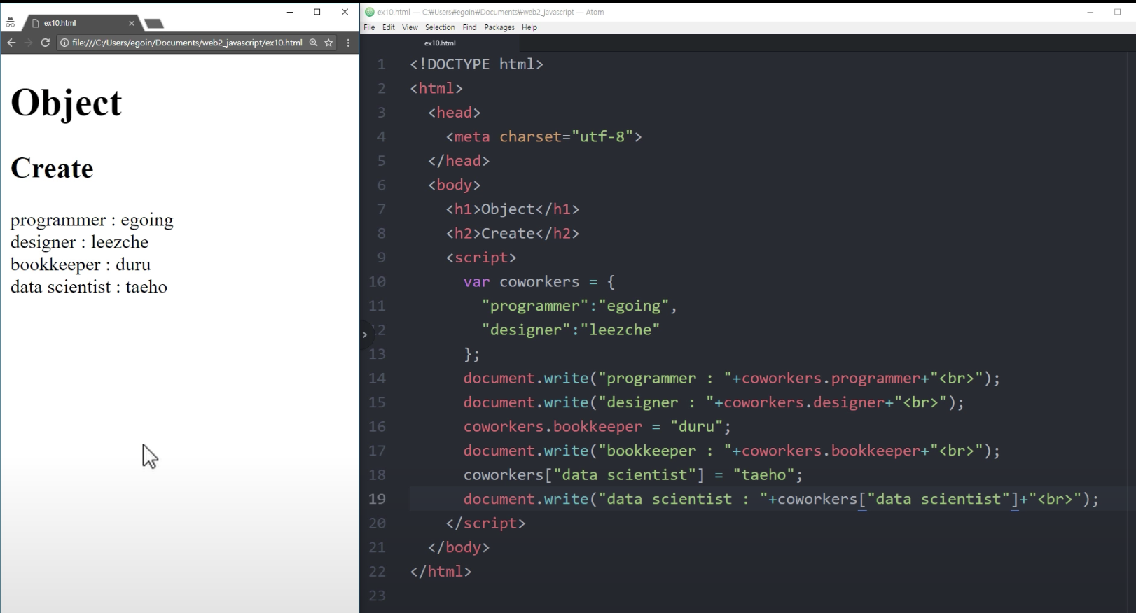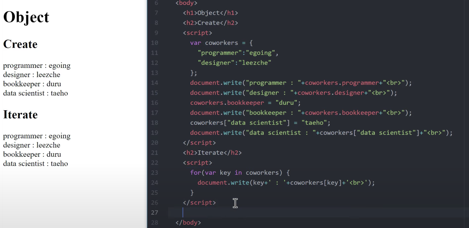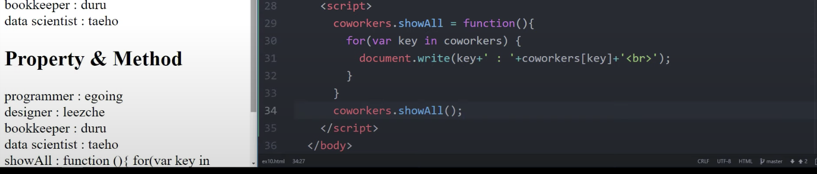 coworkers์ ๊ฑธ๋ ค์๋ ํจ์์ธ function(){ }์ ํด๋นํ๋ ๋ด์ฉ์ด ๋ฐ๋ก method์ด๊ณ ,
