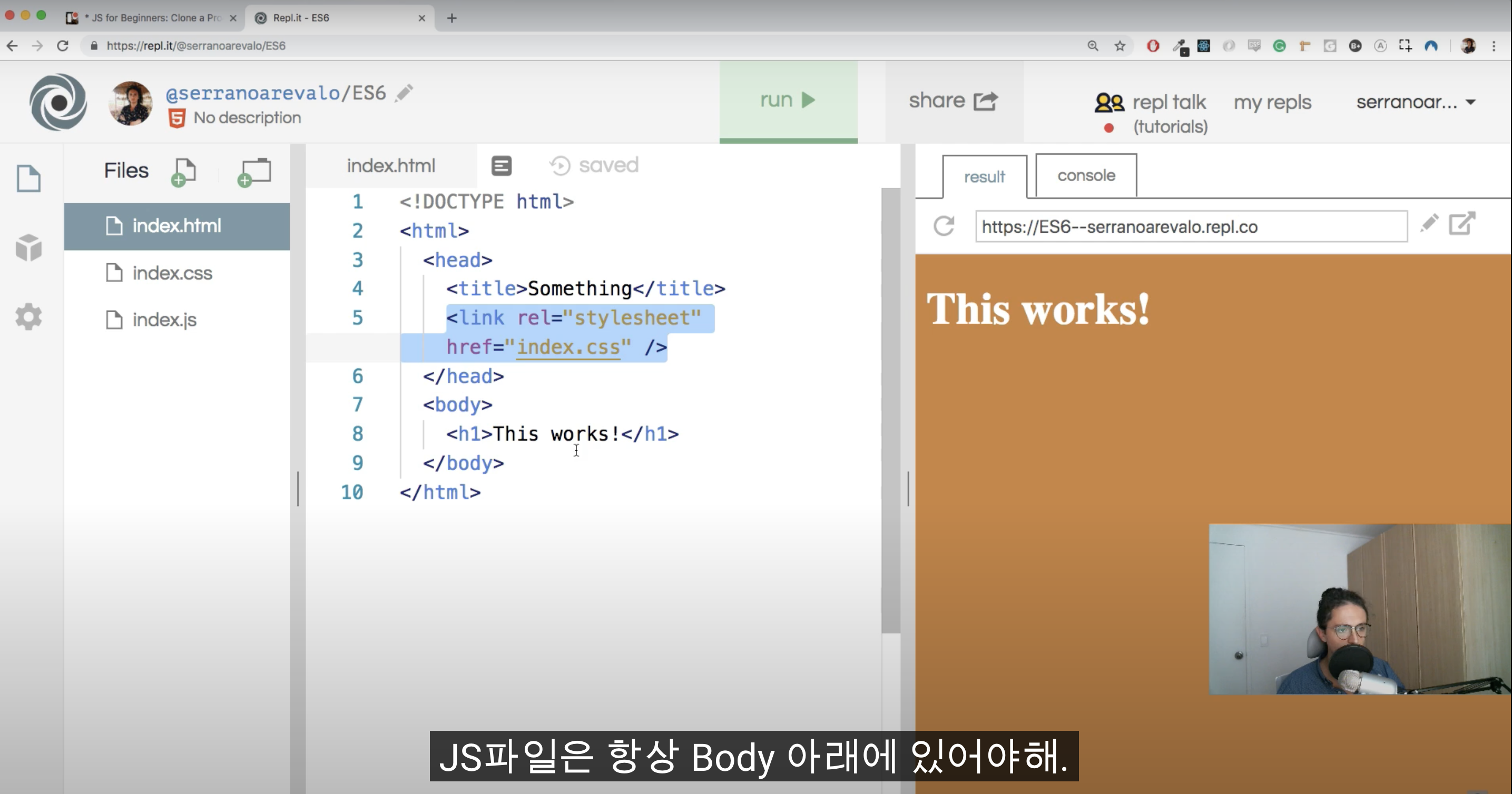 ์ํ์ฝ๋ฉ์์๋ js src๋ฅผ head์๋ค๊ฐ ์ฝ์ ํ๋ ๊ฒ ๊ฐ์๋ฐ, js ํ์ผ์ ํญ์ body์ ๋งจ ๋์ ์์ผํ๋ค๊ณ ํ๋ค.