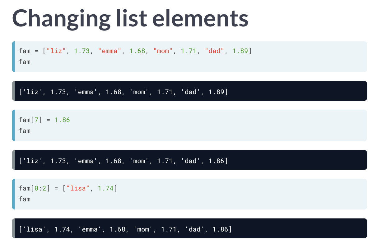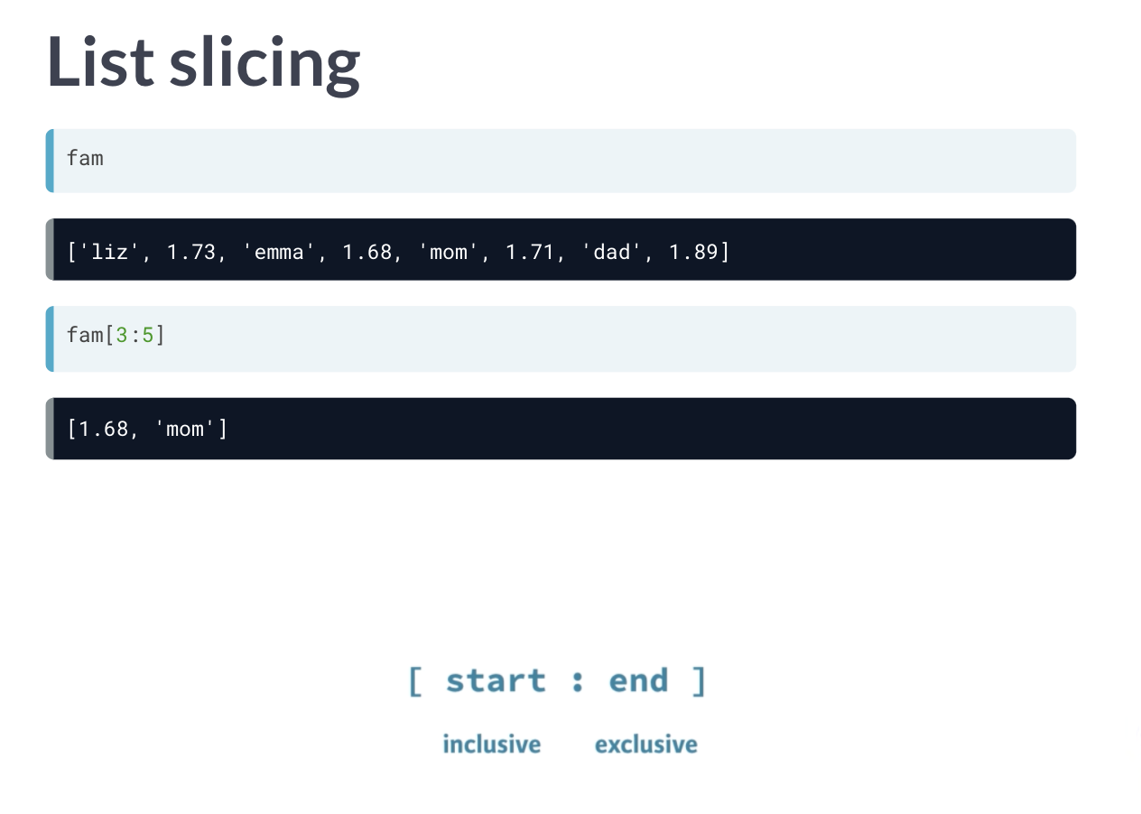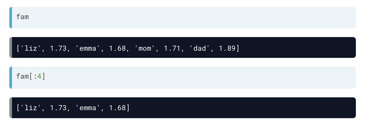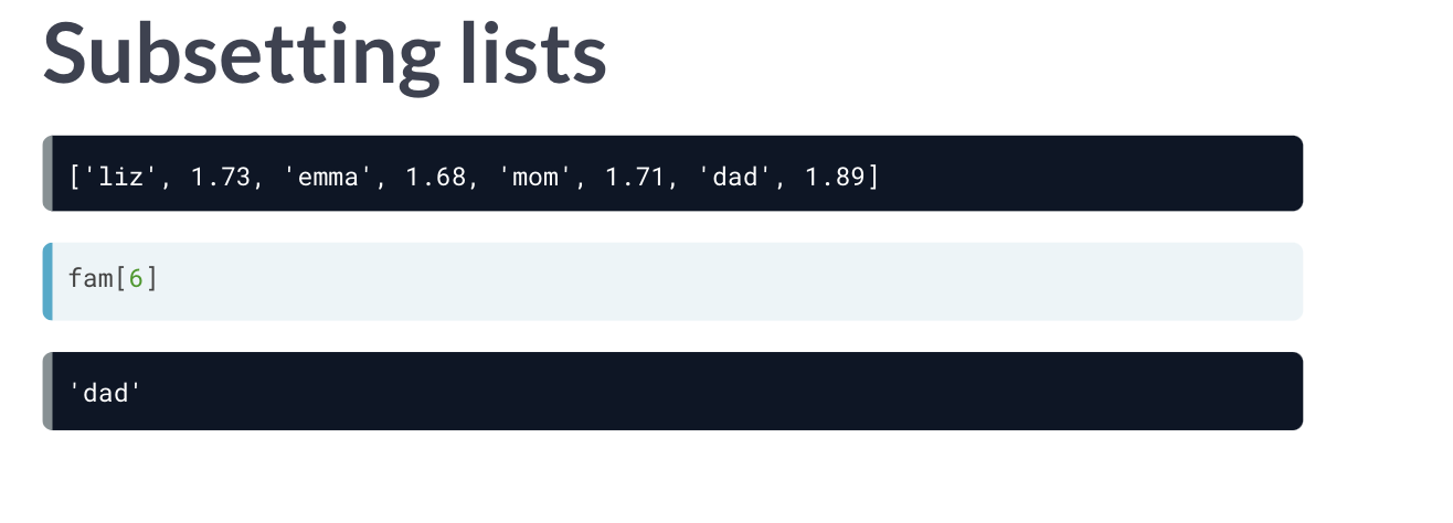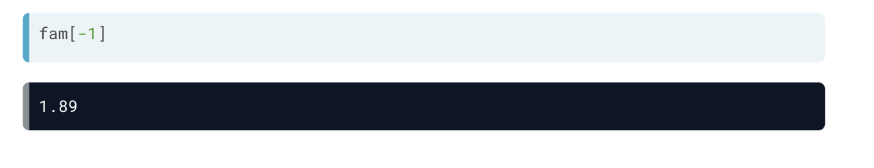 list ์์ elements๋ค์ ์์์๋ถํฐ 0, 1, 2, 3 ...์ index๊ฐ์ ๊ฐ๋๋ค. ์ฆ ์์ fam list๋ฅผ ๋ณด๋ฉด, 'liz'๋ผ๋ string element๋ '0'๋ฒ์งธ element์ธ๊ฑฐ๊ณ , 7๋ฒ์งธ element๋ 'dad'๊ฐ ํด๋น๋๋ค. ์ด๋ฅผ ํธ์ถํ๋ ๋ฐฉ๋ฒ์ fam[6]๊ณผ ๊ฐ์ด ๋๊ดํธ ์์ index ๋๋ฒ๋ฅผ ์จ์ฃผ๋ฉด ๋๋ค. ๋ฆฌ์คํธ์ ๋์์๋ถํฐ ๊ฐ๊น์ด ๊ฐ์ ์ถ๋ ฅํ๋๋ฐ๋ 'negative index'๋ฅผ ์จ์ฃผ๋ ๋ฐฉ๋ฒ๋ ์๋ค.
