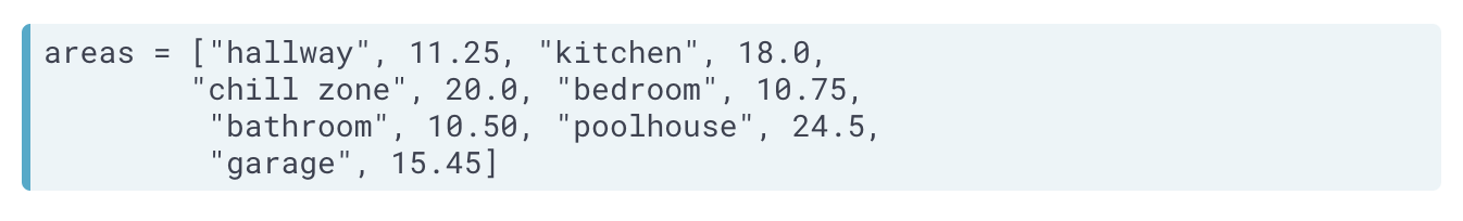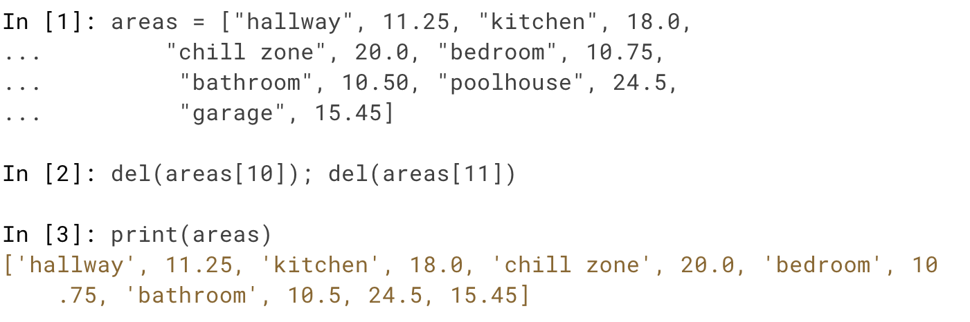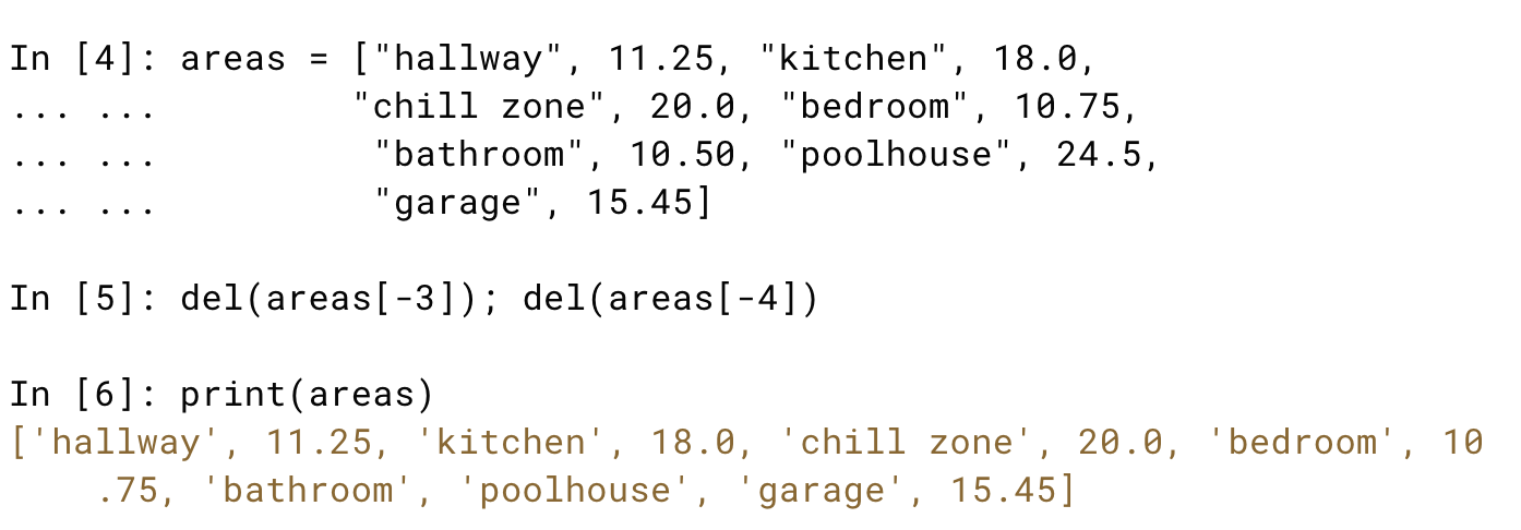 element๋ฅผ ์ ๊ฑฐํ๋ ์๊ฐ, ๋ฆฌ์คํธ์ index ๊ฐ์ด ์ฆ์ ์์ ๋๋ค. ๋ฐ๋ผ์ ๋ณต์์ elements๋ฅผ ์ญ์ ํ๋ ์ํฉ์ผ ๋, ์ฆ๊ฐ์ฆ๊ฐ index ๊ฐ์ด ๋ณํํ๋ ๊ฒ์ ๊ณ ๋ คํด์ผ ํ๋ค. ๋ง์ธ ์ฆ์จ, ๋ค์๊ณผ ๊ฐ์ ๋ฆฌ์คํธ์์ "poolhouse", "24.5" ์ด ๋๊ฐ์ง element๋ฅผ ์ ๊ฑฐํด์ผํ๋ ์ํฉ์ ๊ฐ์ ํด๋ณด์.