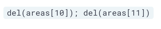 ํด๋น element๋ค์ ์ด๊ธฐ index ๊ฐ์ areas[10], areas[11] ํน์ areas[-4], areas[-3]์ด๋ค. ๊ทธ๋ฐ๋ฐ ๋ง์ฝ์ ๋ค์๊ณผ ๊ฐ์ด ์ ๊ฑฐํ๋ค๊ณ ํ์ ๋ index ๊ฐ์ด ๋ฐ๋๊ธฐ ๋๋ฌธ์ ์ค๋ฅ๊ฐ ์๊ธฐ๊ฒ ๋๋ค.