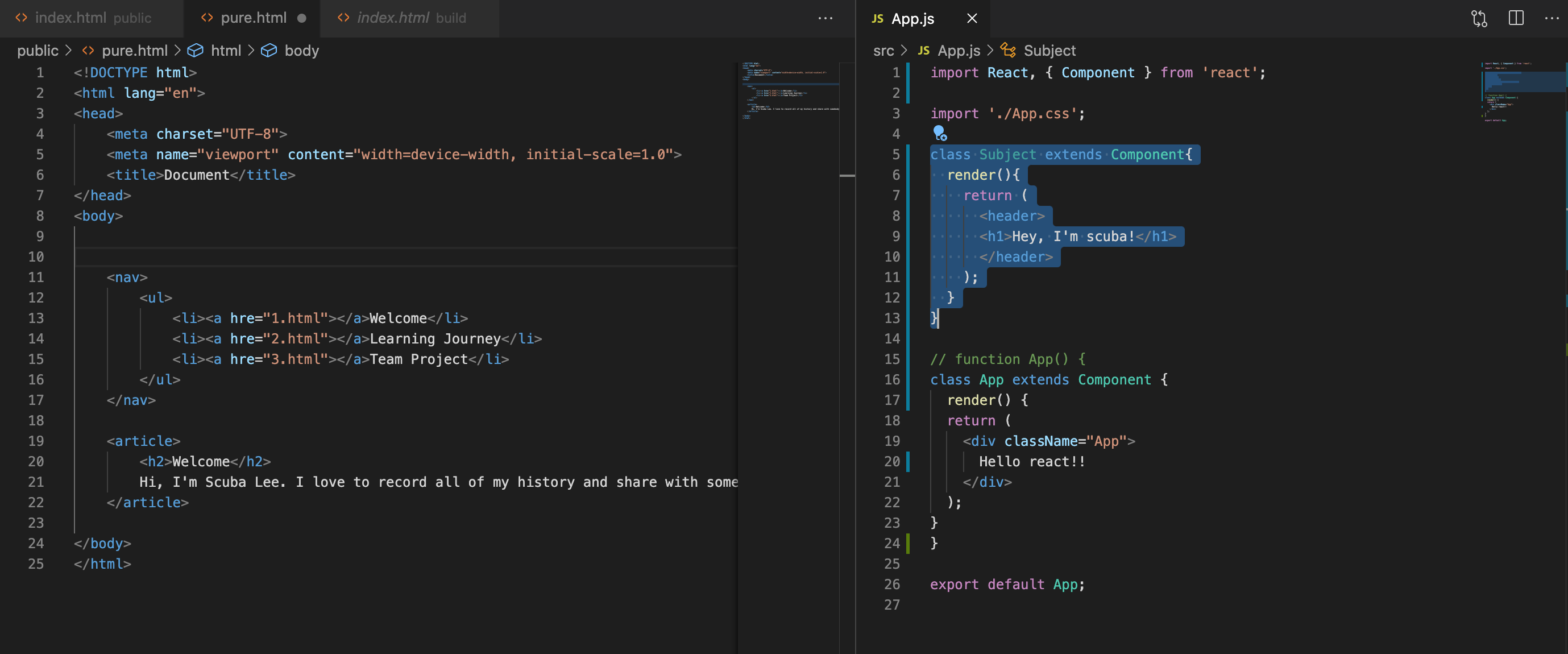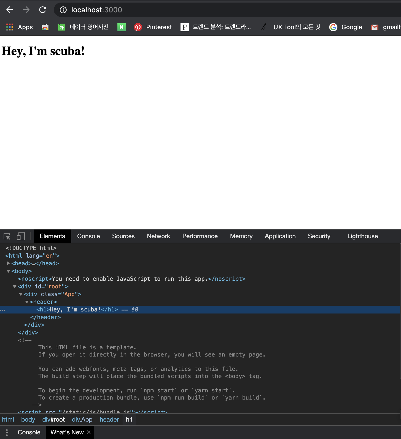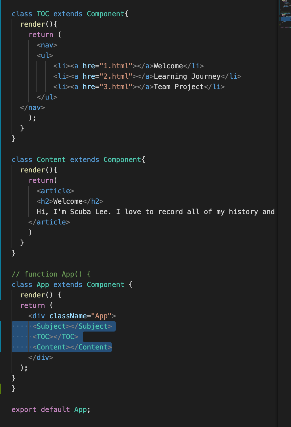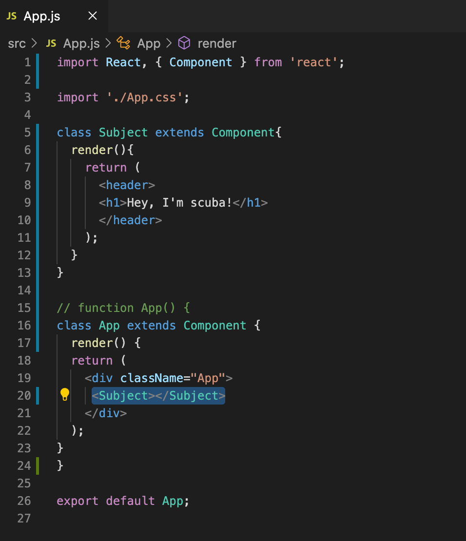 ์ค์ App.js์๋ <Subject>ํ๊ทธ๊ฐ ์ ํ์๋๋ฐ, ์น์์์๋, ํด๋น ํ๊ทธ๋ฅผ ์์์ <header>ํ๊ทธ๋ก ์ฝ์ด์ฃผ๋ ๊ฒ์ ํ์ธํ ์ ์๋ค.