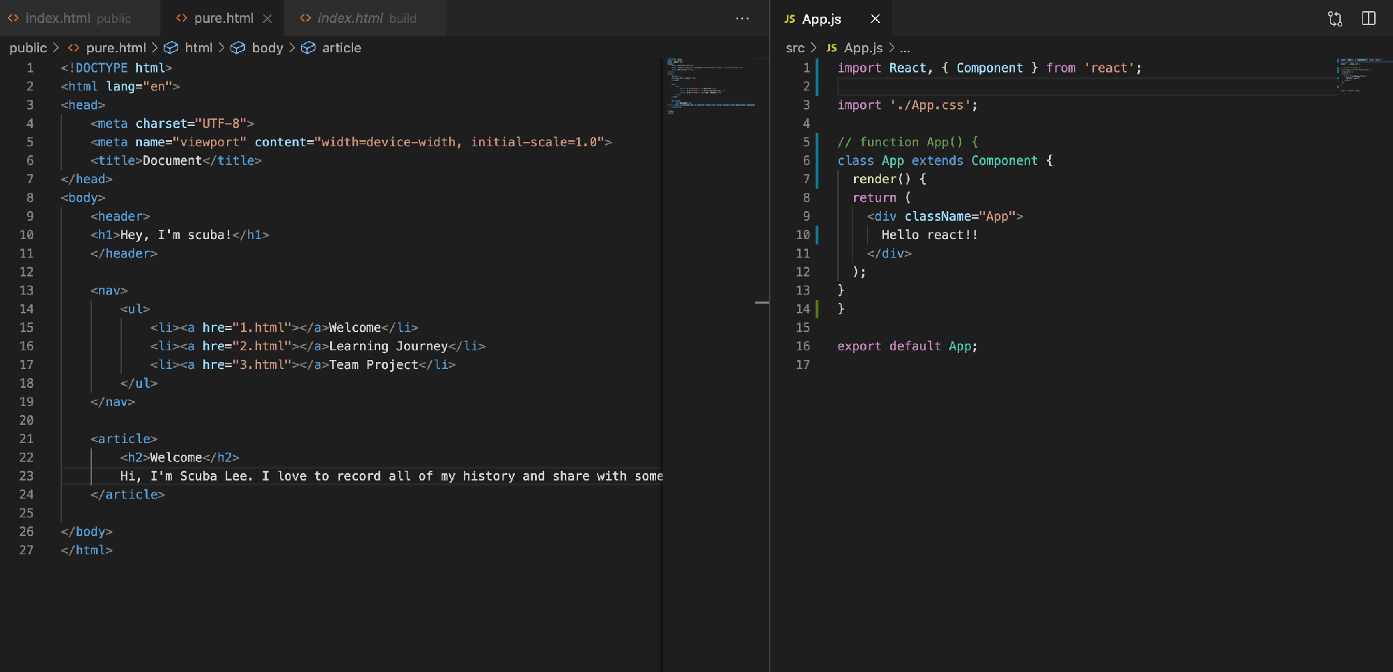 ์ด๋ ๊ฒ ์ฌํํ html ์ฐ์ต ํ์ผ์ ํ๋ ๋ง๋ค์ด์ค ๋ค, ๋ฆฌ์กํธ์ src ๋๋ ํ ๋ฆฌ์ App.js๋ฅผ ์ด์ด์ค๋ค.