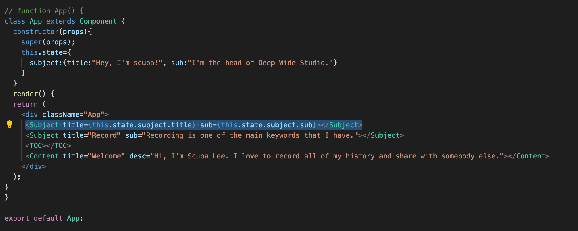 ์ปดํฌ๋ํธ ์์๋ค title, sub ๊ฐ๋ค์ ์ ๋ ๊ฒ ์ ์ด์ฃผ๋๊ฒ ์ง์ ๋ถํด์ ์๋ก ์ ํ๊ณ ๋ฐ๋ก ๋นผ์ฃผ๋ ค๊ณ ํ๋ค. ๊ทธ๋ ํ์ํ ๊ฒ์ด ๋ฐ๋ก ํ๋จ์