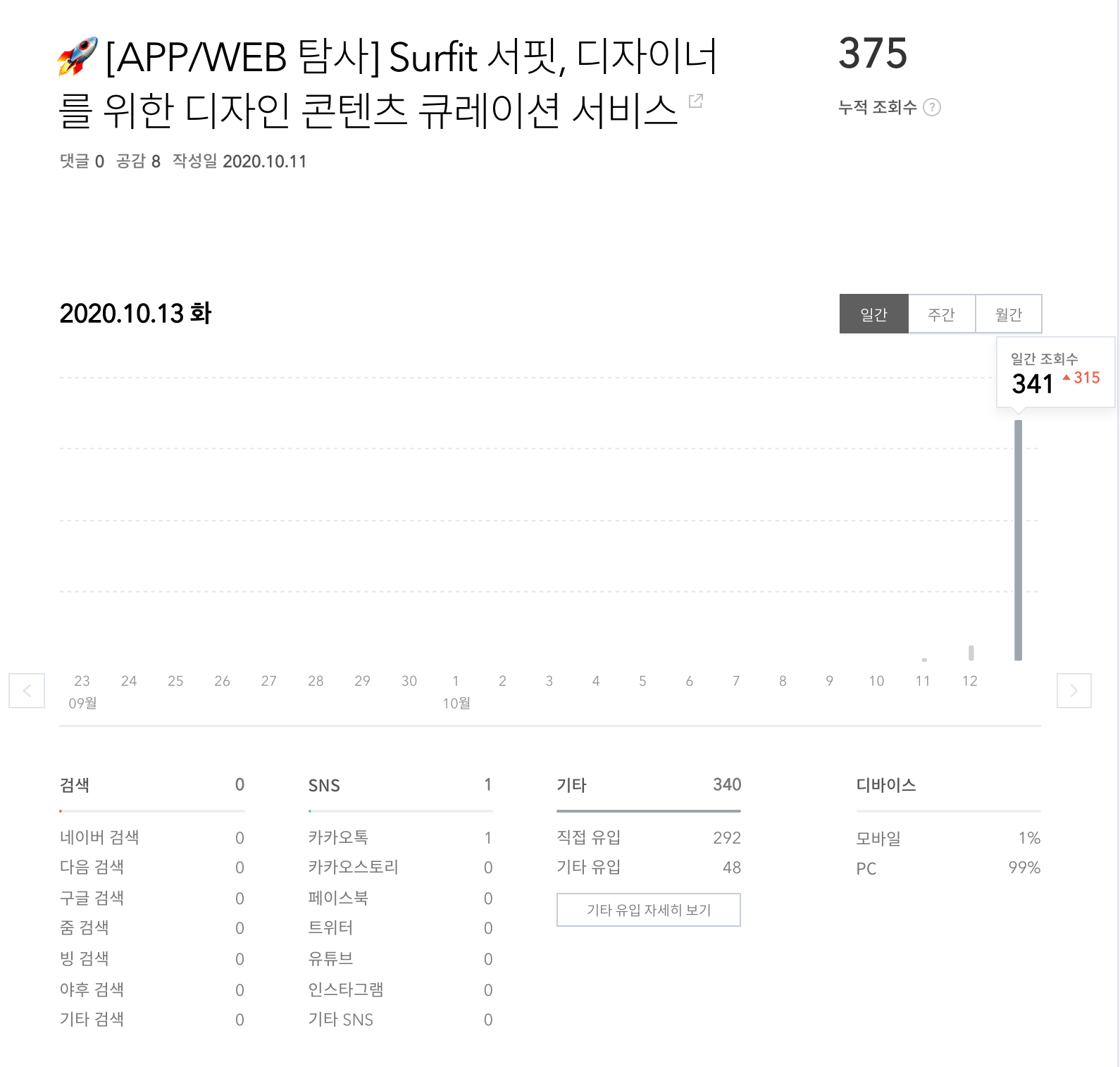 Tistory ํต๊ณ๋ถ์ ํญ์์, ํด๋น ์ฝํ ์ธ ์ ๋ํ ๋จ๋ ํต๊ณ์น๋ฅผ ์ดํด๋ณด๋, ๋ชจ๋ฐ์ผ๋ก ํ์ธํ ๋น์จ์ 1%~2%์ด๊ณ , PC๋ก ํ์ธํ ๋น์จ์ 98%~99%์๋ค. ํด๋น ํฌ์คํ ์ ๋ํ ์ผ๊ฐ ํ์ธ์๊ฐ 400์ฌ๋ช ์ด๋ผ๋ ๊ฒ์ ์ ์ ์ซ์์ผ ์๋ ์์ง๋ง, ๊ธฐ์กด ๋ฐฉ๋ฌธ์ ์ถ์ด ๋๋น ๊ต์ฅํ ์์๋ผ์ด์ด์ ํด๋นํ๋ค. ๊ทธ๋ฆฌ๊ณ ์ด๋ค์ 99%๊ฐ PC๋ก ํ์ธํ๋ค๋ ๊ฒ๋ ๊ฝค๋ ์ด๋ก์ ์ด๋ค. ์์ผ๊น?