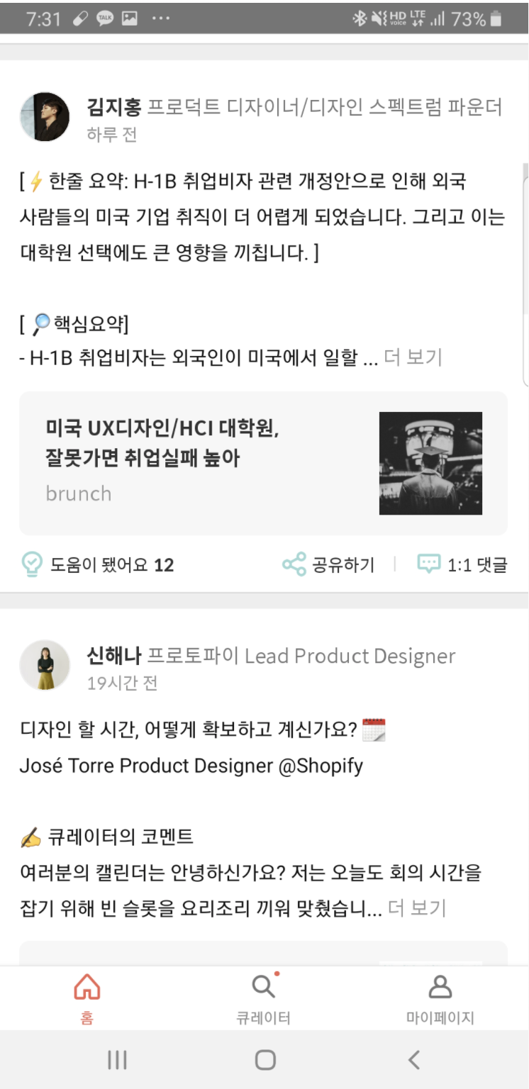 ๊ทธ๋ฌ๋ ๋ชจ๋ฐ์ผ๋ก ๋์ด์์ ๋๋ PC์์ ์ฅ์ ์ผ๋ก ์์ฉํ๋ ์ฝํ ์ธ ์นด๋์ ์ฝํ ์ธ ์ด๋ฏธ์ง๊ฐ ๋จ์ ์ผ๋ก ์ ํ๋๋ ๊ฒ ๊ฐ๋ค. ์ฝํ ์ธ ์นด๋์ ์ด๋ฏธ์ง๊ฐ ๋ชจ๋ฐ์ผ ์์์๋ ๋๋ฌด ํฌ๊ฒ ์ฐจ์งํด, ํ์ ๋ ํ๋ฉด ๋ด์์ ํ ๋ฒ์ ์ต๋ํ ์ ์๋ ์ ๋ณด๋์ด ๋๋ฌด ์ ์ด์ง๊ธฐ ๋๋ฌธ์ด๋ค. ๋ฐ๋ฉด ํผ๋ธ๋ฆฌ์์ ์ฑ์ผ๋ก ์ถ์ํ ๋น์ฆ๋์ค ์ธ์ฌ์ดํธ๊ฐ ๋ด๊ธด ๋ด์ค/์ํฐํด ํ๋ ์ด์ ์๋น์ค์ธ Publy News์ ๋น๊ตํด๋ณด๋ฉด, Publy News ๋ ํ๋ฒ์ ํ ํ๋ฉด์์ ํ์ธํ ์ ์๋ ์ ๋ณด๋์ด ๋ ๋ง๋ค. ๋ฌผ๋ก ์ํ์์๋ ๋์์ด๋๋ฅผ ์ํ ์ฝํ ์ธ ๊ฐ ํต์ฌ์ด๊ธฐ ๋๋ฌธ์, ๋ชจ๋ฐ์ผ ์์์๋ ์ฌ์ ํ ์ฝํ ์ธ ์นด๋์ ์๊ฐ ์ ๋ณด๊ฐ ์ค์ํ ์๋ ์๋ค. ๊ทธ๋ฌ๋ ๊ฐ์ธ์ ์ผ๋ก๋ PC์์ ์ํ์ ์ฌ์ฉํ ๋ ๋๊ผ๋ 'ํ๋์ ์๋ก์ด ์ ๋ณด๋ค์ด ์ฐ์ฌํจ์ ๋ฐ๋ก ํ์ ํ ์ ์์'์ด๋ผ๋ ์ข์ UX๊ฒฝํ์ด ๋ชจ๋ฐ์ผ๋ก๋ ์ฎ๊ฒจ์ง์ง ์์์ '๋ชจ๋ฐ์ผ์์๋ ๋ ๋ถํธํ๋ค'๋ ๊ฐ์ ์ ๋๋ผ๊ฒ ๋ ๊ฒ ๊ฐ๋ค. ๋ชจ๋ฐ์ผ์์์ ์ํ ๊ฒฝํ์ ๋์ฌ์ผ ํ ๋์ฆ๊ฐ ์๊ธด๋ค๋ฉด, ๋ชจ๋ฐ์ผ์์๋ง ์ฝํ ์ธ ์นด๋์ ์ด๋ฏธ์ง ๋น์ค์ ์ถ์ํ๊ณ ๋ฏธ๋ฆฌ๋ณด๊ธฐ ํ ์คํธ๋ฅผ ์กฐ๊ธ ๋ ๋๋ฆฌ๋ ์ง ํด๋ณด๋ฉด ์ด๋จ๊น? ๊ฐ๋ณ๊ฒ ๋์ ธ๋ณธ๋ค. (๋ฌผ๋ก ํ ์คํธ๊ฐ ์๊ณ ์ด๋ฏธ์ง๋ง ์๋ ์ฝํ ์ธ ์ ๊ฒฝ์ฐ ์ด๋ฏธ์ง๋ง ์ด๋ ค์ผ๊ฒ ์ง๋ง.) [์ด๋ฏธ์ง์ ํ ์คํธ]๋ก ๊ตฌ์ฑ๋ ์ํ์ ์ฝํ ์ธ ์นด๋๋ฅผ ๋ณด๋ ์ธ์คํ๊ทธ๋จ์ด ๋ ์ค๋ฅด๊ธฐ๋ ํ๋ค. ์ธ์คํ๊ทธ๋จ์ ์คํ๋ ค ๋ชจ๋ฐ์ผ์์ ๊ทธ ์ด๋ ํ ์ฑ๋ณด๋ค ํธํ๊ณ ์ต์ํ๊ฒ ์ฌ์ฉํ๋๋ฐ, ์ํ๊ณผ ๋ญ๊ฐ ๋ค๋ฅผ๊น ์๊ฐํด๋ณด์๋ค. ์ํ์ ์ด๋ฏธ์ง ์ค์ฌ์ ํํฐ๋ ์คํธ์ ํ ์คํธ ์ค์ฌ์ Publy News์ ์ค๊ฐ ์ด๋์ฆ์์ธ ๊ฒ ๊ฐ๋ค. ๊ฒฐ๊ตญ, ์๋น์ค ์ฌ์ฉ์์ ์ฌ์ฉ ๋ชฉ์ ์ด ์ค์ํ ๊ฒ ๊ฐ๋ค.