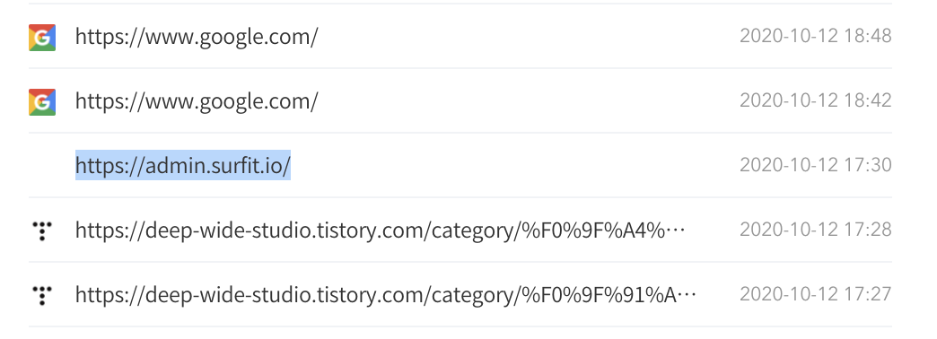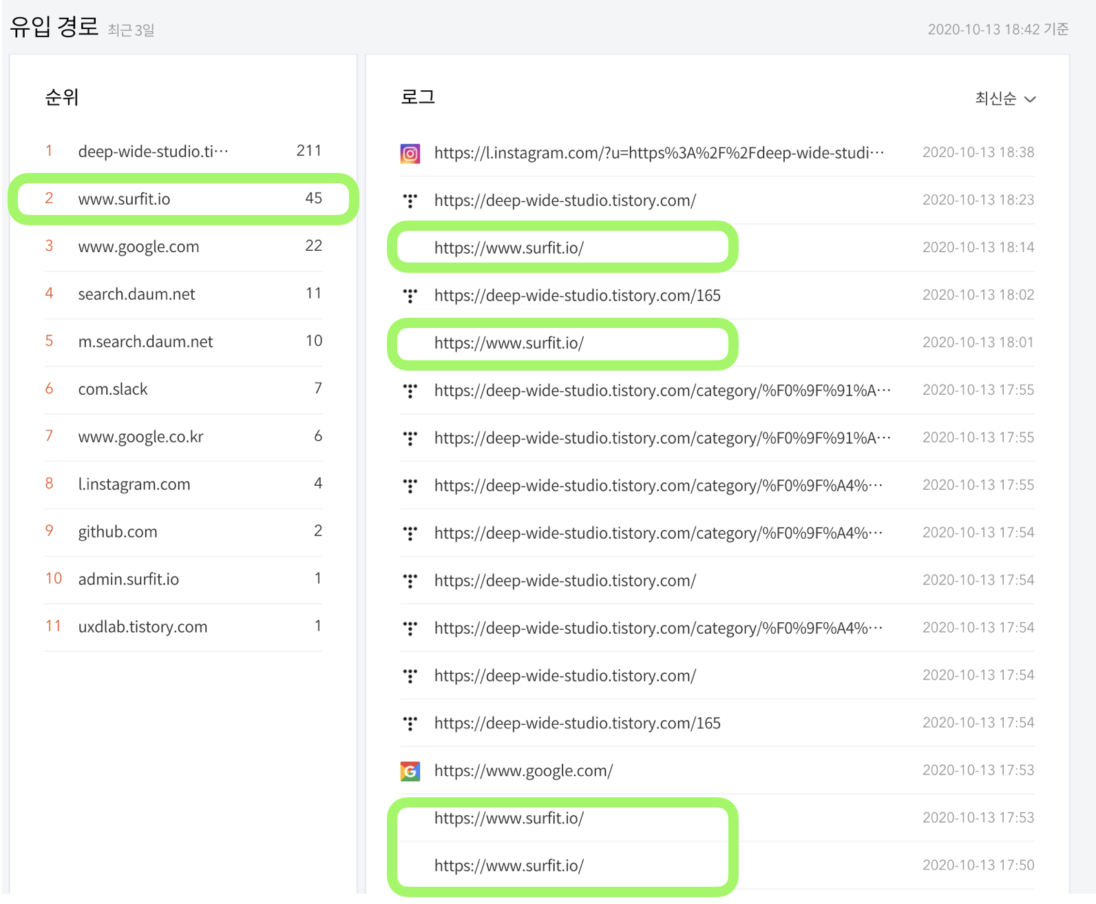 ๋ณด๋ค ์์ธํ ๋ด์ฉ์ ํ์ธํ๊ธฐ ์ํด, Tistory์ '์ ์ ๊ฒฝ๋ก'๋ฅผ ํ์ธํด๋ณด์๋ค. ํ์์ ๋ค๋ฅธ ์ ์ ๋ฐ๊ฒฌํ ์ ์์๋๋ฐ, ํ๋ฃจ๋์ ์ ์ ๋ ๋ก๊ทธ ์ค์ Tistory ๋ฉ์ธ ํ์ด์ง์ "https://www.surfit.io/"๋ผ๋ ์ขํ๊ฐ ๋ฐ๋ณต์ ์ผ๋ก ๋ฑ์ฅํ๋ค.