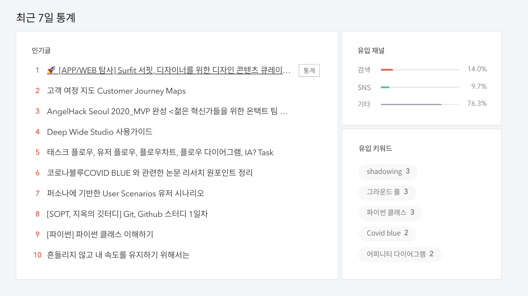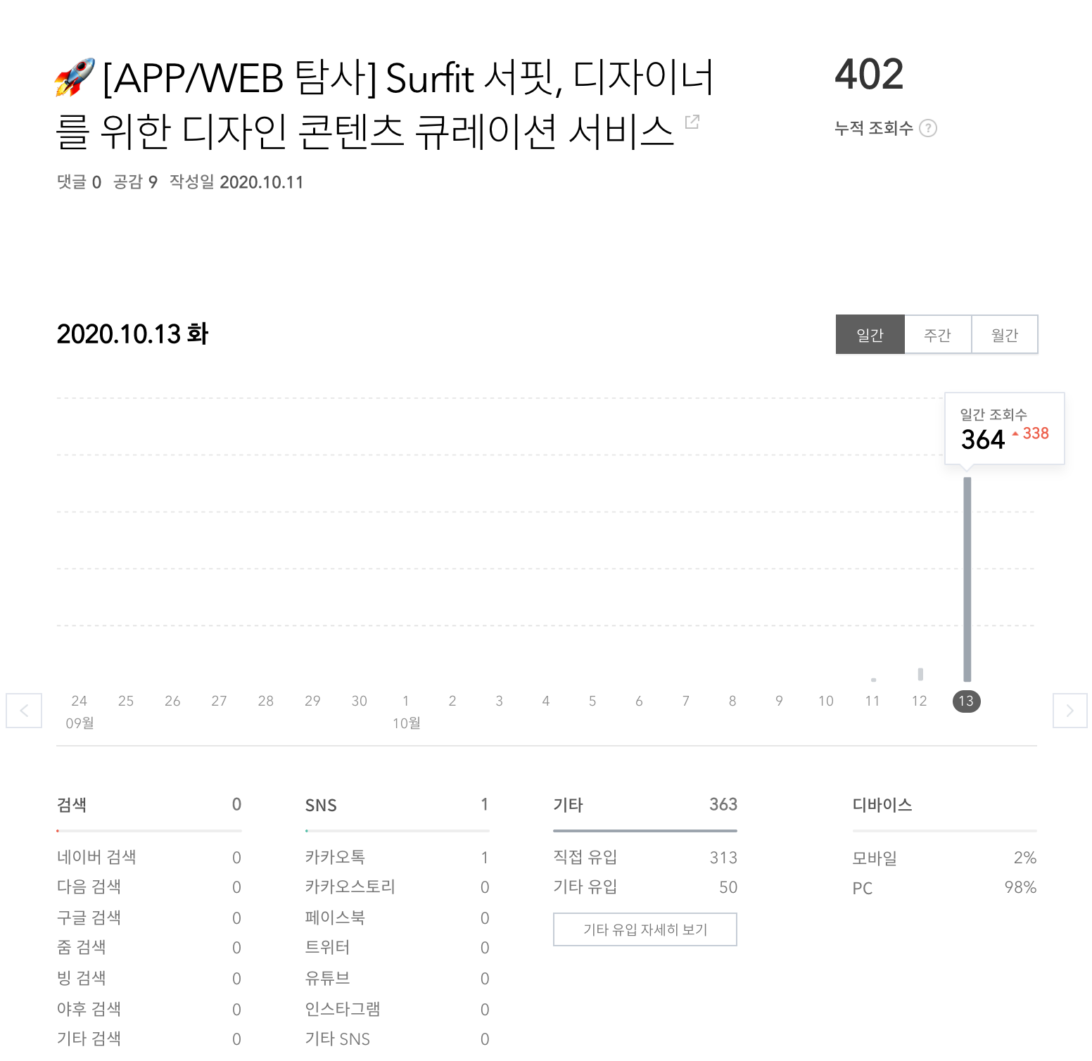 ํ ๊ฐ์ง ์๋ฌธ์ ์ ์ ์ ๋ก๊ทธ์ surfit ์ธ์๋ ์์ ์นดํ ๊ณ ๋ฆฌ ํ์ด์ง๋ ๊ทธ๋ฅ ๋ด tistoryhttps://deep-wide-studio.tistory.com/ ์ขํ๋ก ์ ์ ๋ ์๊ฐ ์๋นํ ๋์๋ค๋ ๊ฑฐ๋ค. ํ์์ ๋ฐฉ๋ฌธ์์ ์ฐจ์ด๊ฐ ๋์ ์ด์ ์ค์๋ '์ํ'์ ๋ ธ์ถ๋์๋ค๋ ์ ์ด ๋ถ๋ช ํ๋ฐ, surfit ์ฃผ์๋ก ์ ์ ๋ ์๋ ์ค์ 45๊ฑด์ ์ง๋์ง ์๋๋ค. ์ํ์ ์ฌ๋ผ๊ฐ ๊ฒ์ ๊ณ๊ธฐ๋ก ๋ค๋ฅธ ๊ณณ์๋ ๋ด ํฐ์คํ ๋ฆฌ ์ฃผ์๊ฐ ๋ ธ์ถ๋ ๊ฑธ๊น? ์๋ํ๋ฉด, ํ์คํ ๊ฑด ์ด๋ ์ ์ ๋ ๋๋ค์์ ์ฌ๋๋ค์ด ๐[APP/WEB ํ์ฌ] Surfit ์ํ, ๋์์ด๋๋ฅผ ์ํ ๋์์ธ ์ฝํ ์ธ ํ๋ ์ด์ ์๋น์ค ํฌ์คํ ์ ์ง์ค๋์ด ์๋ค๋ ๊ฒ์ด๊ธฐ ๋๋ฌธ์ด๋ค.