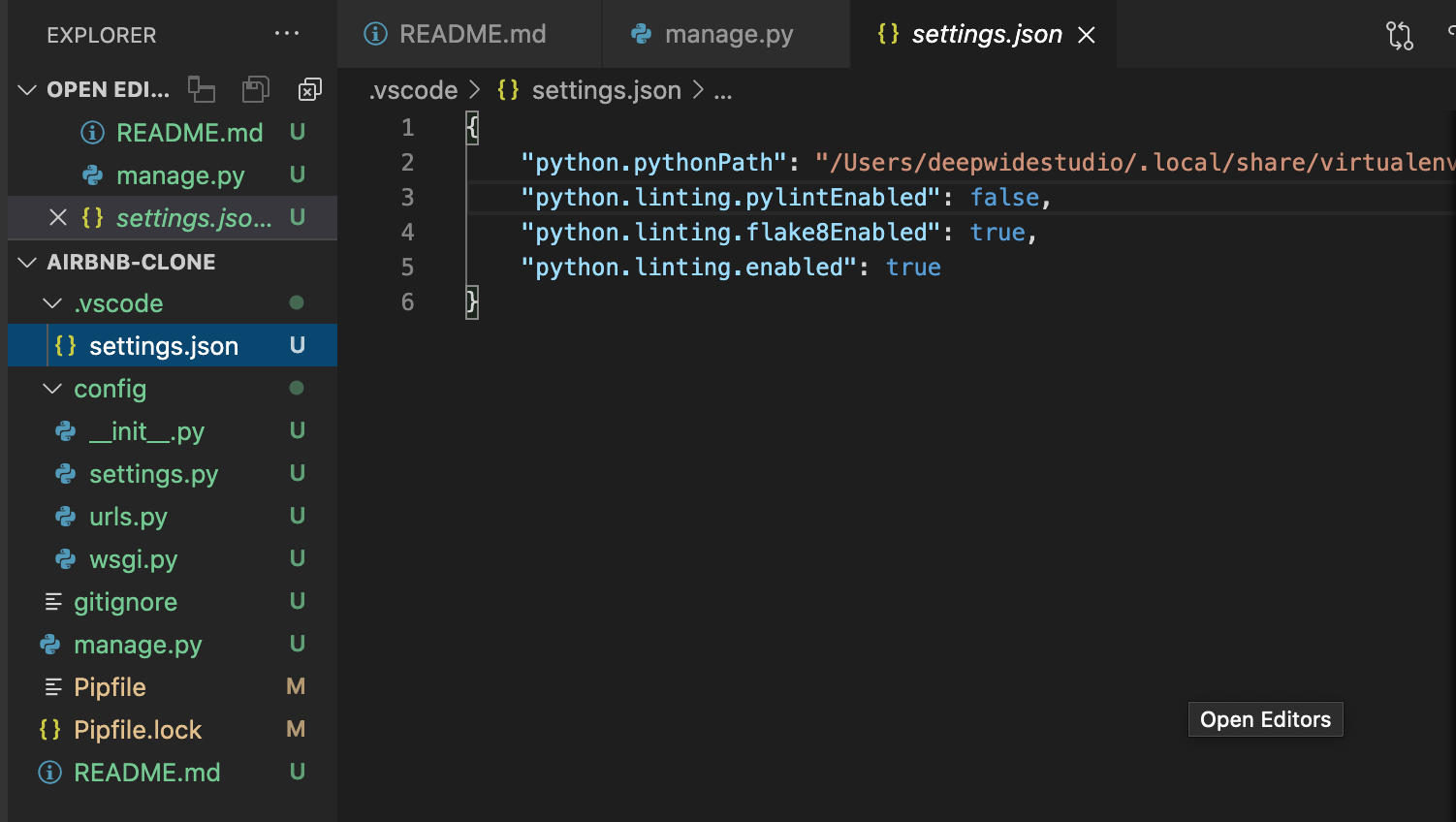 vscode ํด๋์ setting.jsonํ์ผ๊ณผ, pipfile์์ flake8์ด ์ค์น๋ ๊ฒ์ ํ์ธํ ์ ์๋ค.