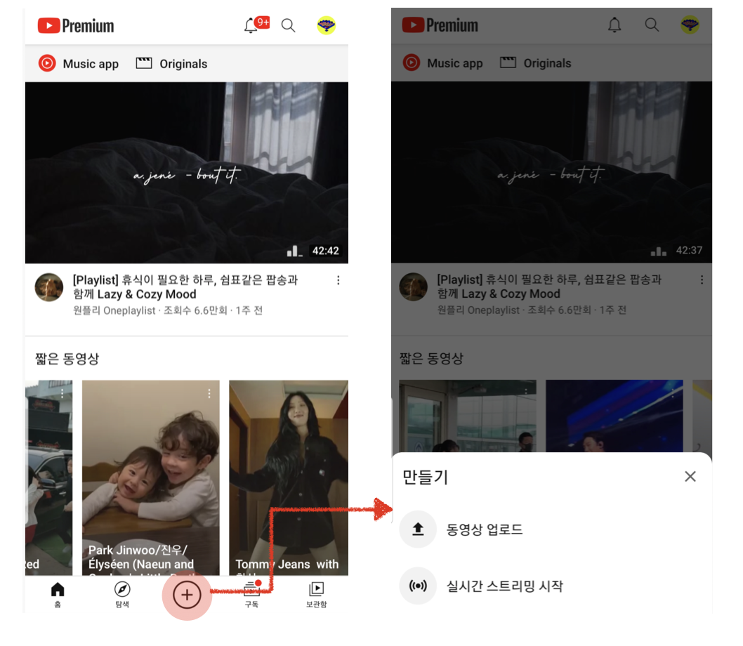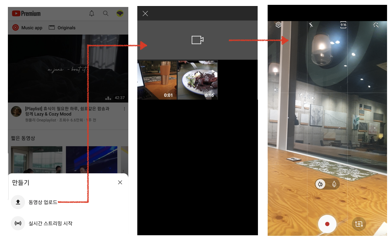 ์ ์ด๋ฏธ์ง๋ ์ด๋ฒ์ ์ ๋ฐ์ดํธ๋ ์ ํ๋ธ ๋ค๋น๊ฒ์ด์ ์ '+' ๋ฒํผ์ ๋๋ ์ ๋ ๋ํ๋๋ ๋ฒ๋ค์ด๋ค. ์์์ ์ดํด๋ณธ ์ธ๋์์ ์ถ์๋ ์ ํ๋ธ ์ผ์ธ ๋ฒ ํ๋ฒ์ ์ ํํ์ ์ผ์นํ๋ค. 'Create a Short'๊ฐ ์๋ค๋ ์ฐจ์ด๊ฐ ์์ ๋ฟ์ด๋ค. '๋์์ ์ ๋ก๋'์ '์ค์๊ฐ ์คํธ๋ฆฌ๋ฐ ์์' ๊ธฐ๋ฅ์ ์ฐจ๋ก๋ก ์ดํด๋ณด๋๋ก ํ๊ฒ ๋ค.
