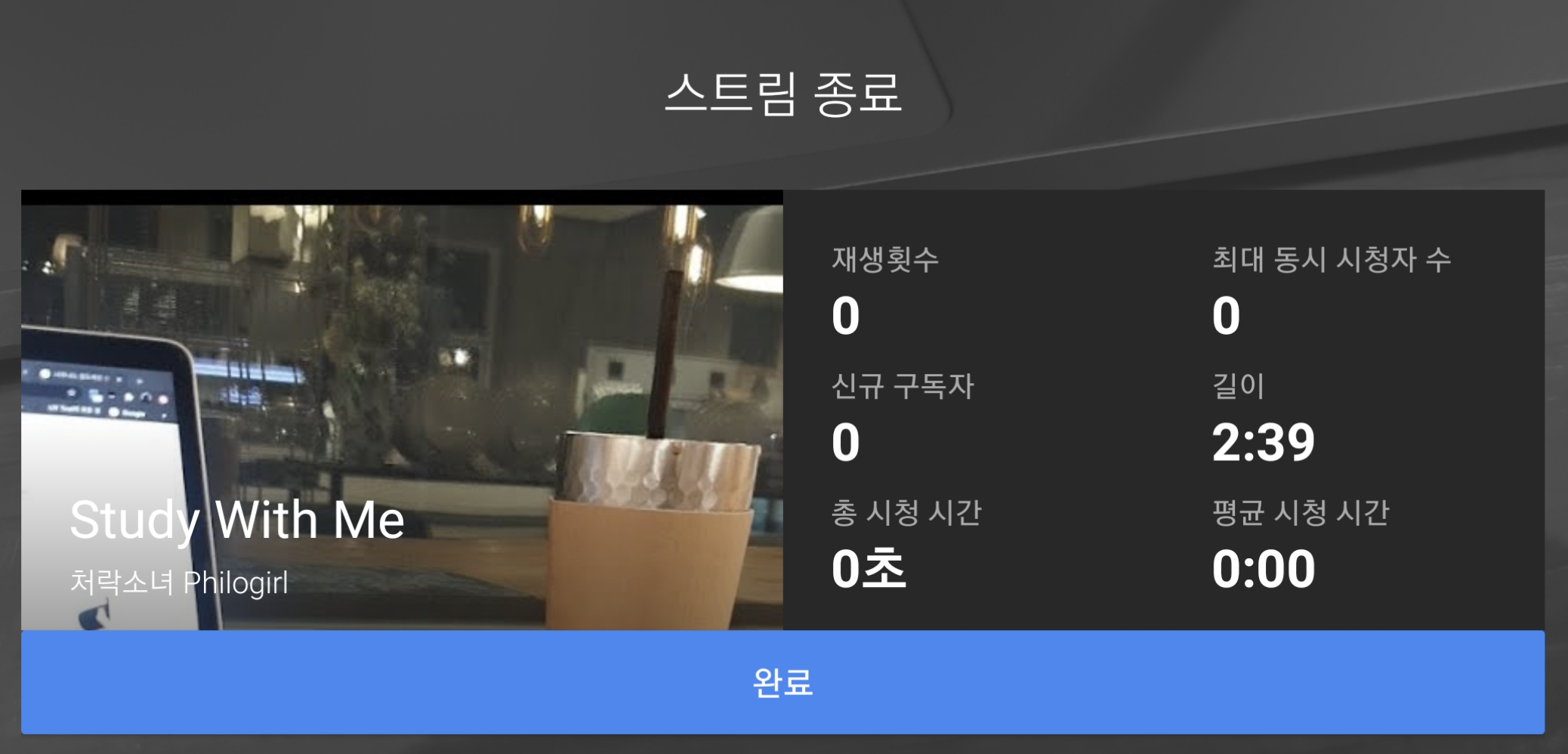 โ๏ธ์คํธ๋ฆผ ์ข ๋ฃ ์ ๋ณธ ์คํธ๋ฆฌ๋ฐ์ ๋ํ ์ ๋ณด๋ฅผ ํ์ธํ ์ ์๋ค. : ์ฌ์ ํ์, ์ต๋ ๋์ ์์ฒญ์ ์, ์ ๊ท ๊ตฌ๋ ์, ์คํธ๋ฆฌ๋ฐ ๊ธธ์ด, ์ด ์์ฒญ ์๊ฐ, ํ๊ท ์์ฒญ ์๊ฐ
