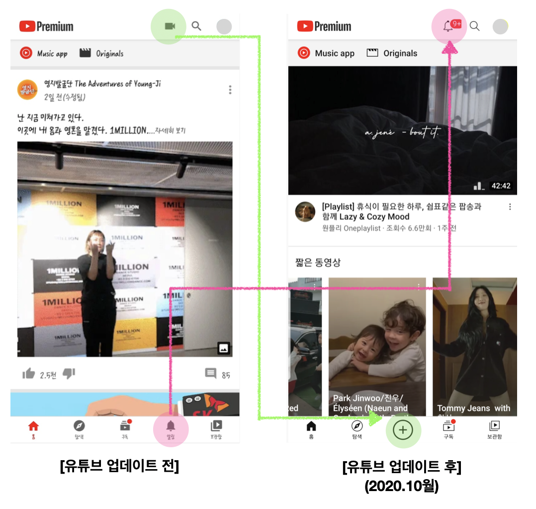 ํ๋ก๋ํธ์ UXUI๋ ๋จ์ง ์ฌ์ฉ์ฑ์ด๋ ๋น์ฃผ์ผ์ ์ธ ๋์์ธ์ ์ํ ๊ฒ์ด ์๋๋ผ, ๋น์ฆ๋์ค์ ์ ๋ต๊ณผ ๋ฐฉํฅ์ฑ์ด ๊ทธ ๋ณธ์ง์ ์๋ค๊ณ ๋ฐฐ์ ๋ค. ์ ํ๋ธ์ UXUI์ ๊ทธ๋์ ๋ง์ ๋ณํ๊ฐ ์์ด์๊ฒ ์ง๋ง, ์ด๋ฒ ์ ๋ฐ์ดํธ์์ ๋ค๋น๊ฒ์ด์ ๋ฐ ๋ณ๊ฒฝ์ ์ ๋ฉด์ ๋ณด์ฌ์ง๋ ๊ฝค ํฐ ๋ณํ๋ผ๊ณ ์๊ฐํ๋ค. ์ฌ์ฉ์๊ฐ ๋ฉ์ธ ๋ทฐ์์ ๋ฐ๋ก ์ฒด๊ฐํ ์ ๋์ ์ด๋ฐ ๋ณํ๋, ๋ด๋ถ์ ์ผ๋ก๋ ์ ํ๋ธ์ ๋ฐฉํฅ์ฑ์ ์๋ก์ด ๋ณํ๊ฐ ์ผ๊ณ ์๋ค๋ ์ ํธ๋ผ๊ณ ์ฌ๊ฒจ์ก๋ค. '+' ์์ด์ฝ์ผ๋ก ํํ๋๋ 'create' ๊ธฐ๋ฅ์ ์ค์ฌ์ผ๋ก, ์ ํ๋ธ๋ฅผ ๋๋ฌ์ผ ์ด์๋ค์ ํ์ ํด๋ณด๊ณ ์ ํ๋ค.