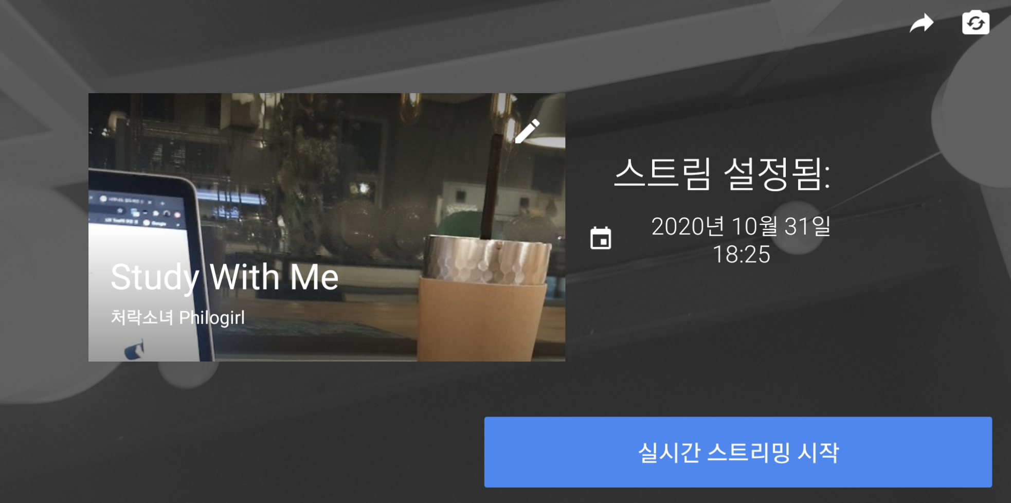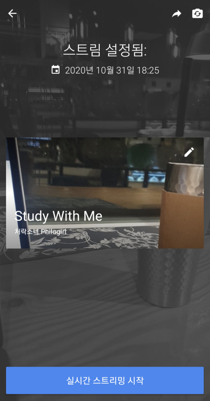 ์คํธ๋ฆฌ๋ฐ ์ ๋ชฉ์ ์ค์ (ํ์์ฌํญ)ํ๊ณ , ๊ฐ๋จํ ์ค๋ช ๋ง ์ถ๊ฐํ๋ฉด(์ ํ ์ฌํญ) ์ค์๊ฐ ์คํธ๋ฆฌ๋ฐ์ ๋ํ ์ค๋น๋ ๋๊ฐ ๋๋๋ค. ๊ต์ฅํ ์ฝ๊ณ ๋น ๋ฅด๊ณ ๊ฐํธํ๊ฒ ๋๊ตฌ๋ ์ค์๊ฐ ์คํธ๋ฆฌ๋ฐ์ ์์ํ ์ ์๋ค. ๋ค๋ง ์คํธ๋ฆฌ๋ฐ ์ธ๋ค์ผ์ ๋ง๋ค๋ ์ฝ๊ฐ ์์ฌ์ด ์ ์ด ์์๋ค.