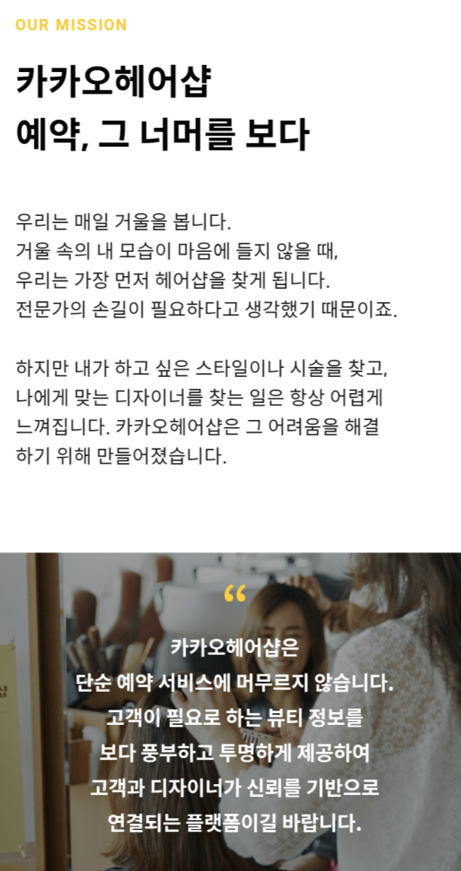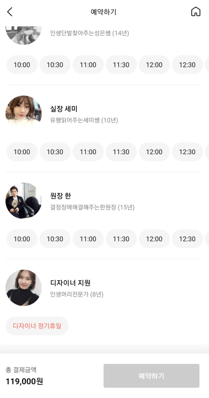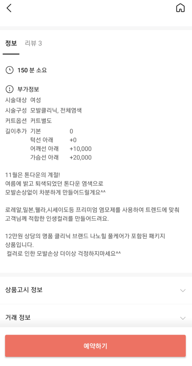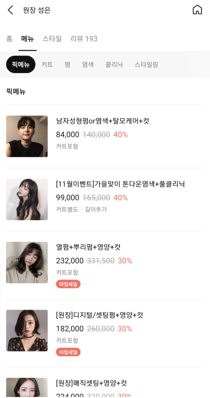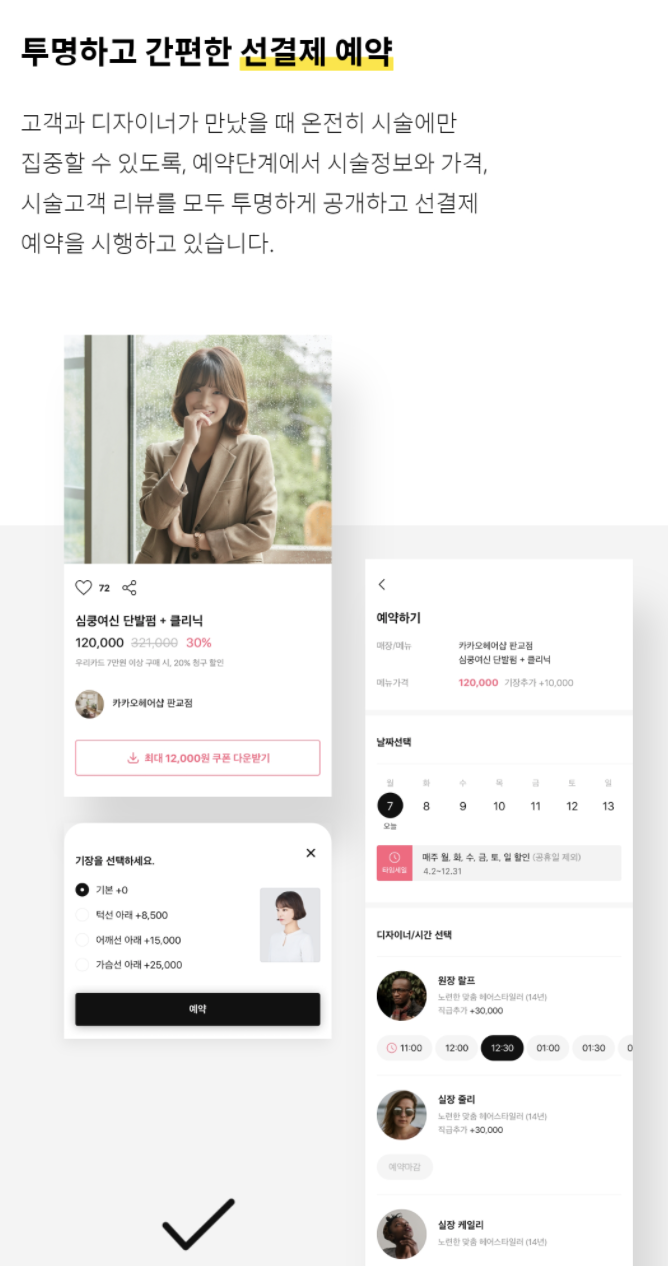 ์นด์นด์คํค์ด์ต ๋ฉ์ธ ๋ทฐ์์ ๊ฐ์ฅ ์ข์๋ ์ ์, ์คํ์ผ๋ง ์ฌ์ง๊ณผ ๊ฐ๊ฒฉ์ด ํจ๊ป ๋ช ์๋์ด ์์๋ค๋ ์ ์ด๋ค. ์ฒซํ๋ฉด์์ ์คํฌ๋กคํ์๋ง์ ๋ฐ๋ก '~~ํ' ๊ฐ๊ฒฉ๊ณผ ํ ์ธ์ ๋ณด์ ๋ํ '์ซ์'๋ฅผ ๋ณด๊ณ '์, ์ด ํ๋ซํผ์์๋ ๋ค์ํ ํค์ด์ต์ ๋ฏธ์ฉ ๊ฐ๊ฒฉ ์ ๋ณด๋ฅผ ํ์ธํ ์ ์๊ฒ ๊ตฌ๋'ํ๋ ๊ธฐ๋๊ฐ์ ๊ฐ์ง ์ ์๋ค. ์์๋ ์ธ๊ธ๋์๋ฏ์ด, ๊ธฐ์กด์๋ ์คํ์ผ๋ง ์ฌ์ง์ ๋ณด๊ณ ๊ทธ๊ฒ์ ๋ํ ๊ฐ๊ฒฉ ์ ๋ณด๋ฅผ ์ฐพ์ผ๋ ค๋ฉด, 1) ๋ค์ด๋ฒ์์ฝํ๊ธฐ ํ์ด์ง๋ก ๋์ด๊ฐ์ '๋ฑ๋ก๋ ๊ฐ๊ฒฉ ์ ๋ณด๊ฐ ์๋ค๋ฉด' ํ์ธ ๊ฐ๋ฅํ๊ณ , ์๋ค๋ฉด 2) ๋ฏธ์ฉ์ค์ ์ง์ ์ฐ๋ฝ or ์ธ์คํ DM์ผ๋ก ํค์ด๋์์ด๋์ ์ง์ ์ฑํ ์๋ด ๊ณผ์ ์ ๊ฑฐ์ณ์ ํ์ธํด์ผํ๋ค. ์ปค๋ฎค๋์ผ์ด์ ์ฝ์คํธ๋ฅผ ์ค์ฌ์ค๋ค๋ ์ ์์ ํธ๋ฆฌํ๋ค.