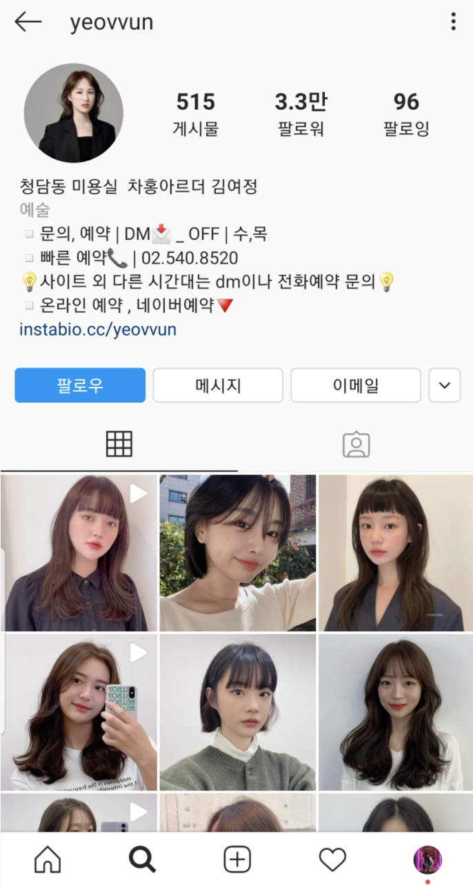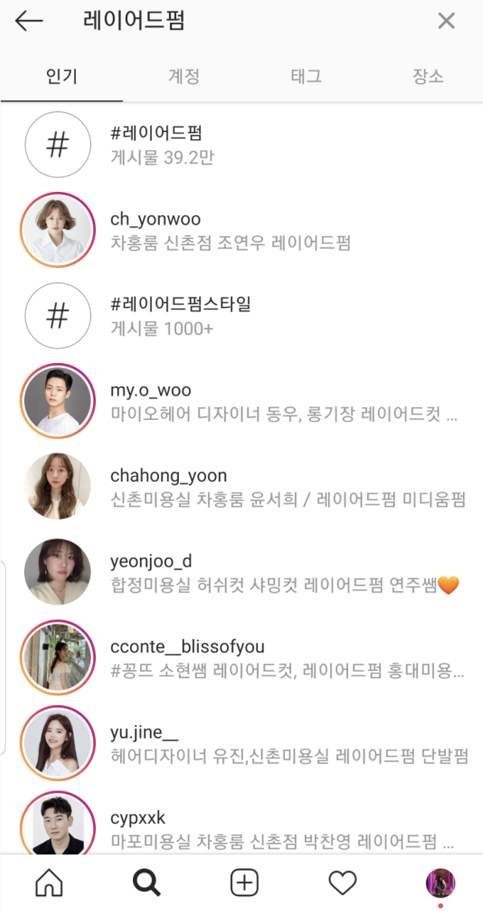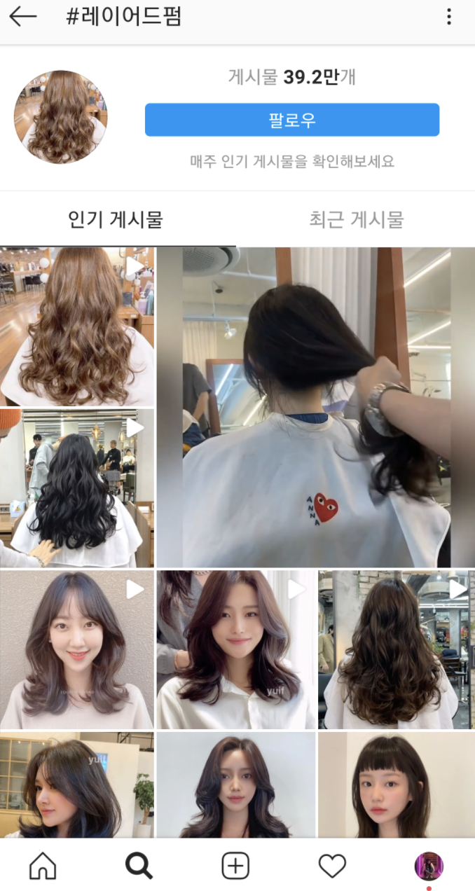 1) ์ธ์คํ๊ทธ๋จ์์# ~~ํ, #~~์ปท, #๊ฐ์์ฌ์๊ธด๋จธ๋ฆฌํ์ถ์ฒ, #ํฉ์ ๋ฏธ์ฉ์ค ๋ฑ์ ๊ฒ์์ด๋ฅผ ์ ๋ ฅํ๋ค.