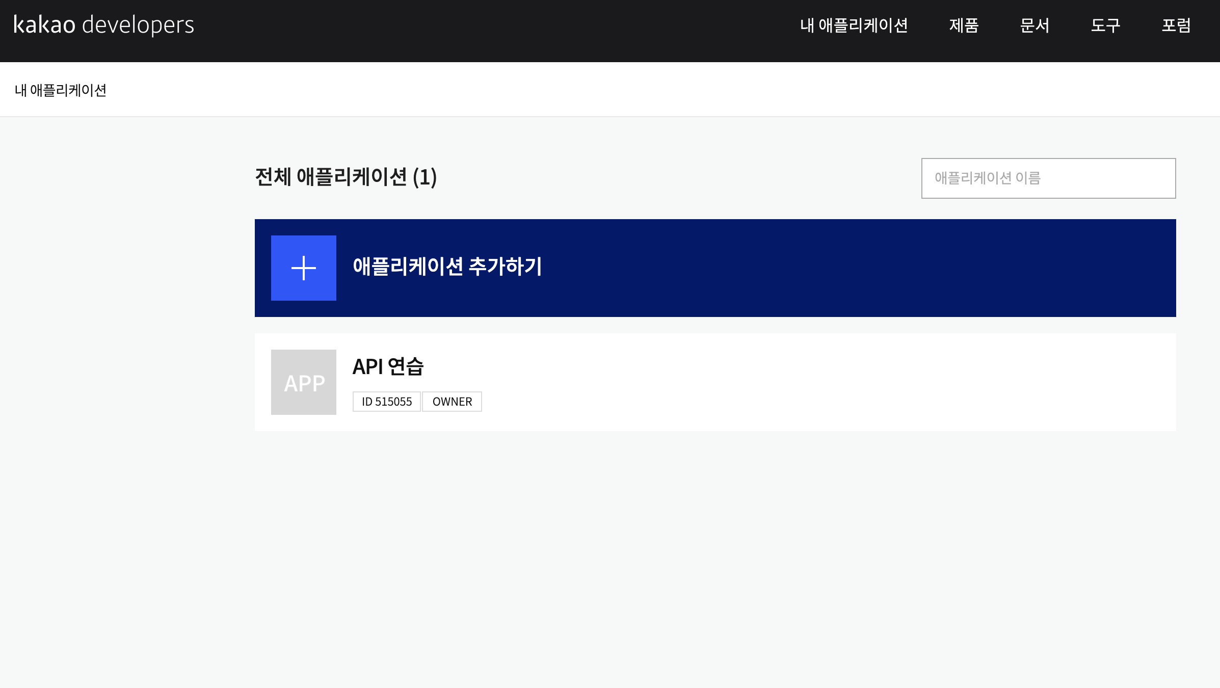 5. ์นด์นด์ค Developer ๋ค์ด๊ฐ์ ์ ํ๋ฆฌ์ผ์ด์ ์ถ๊ฐ๋ฅผ ํตํด API ์ฝ๋๋ฅผ ๋ฐ๊ธ๋ฐ๋๋ค.
