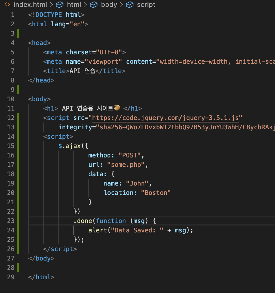 Example ์์๋ฅผ ์ผ๋จ ๊ธ์ด์์, html body ํ๊ทธ ๋ด, script ํ๊ทธ ์์ชฝ์ ๋ณต๋ถ.