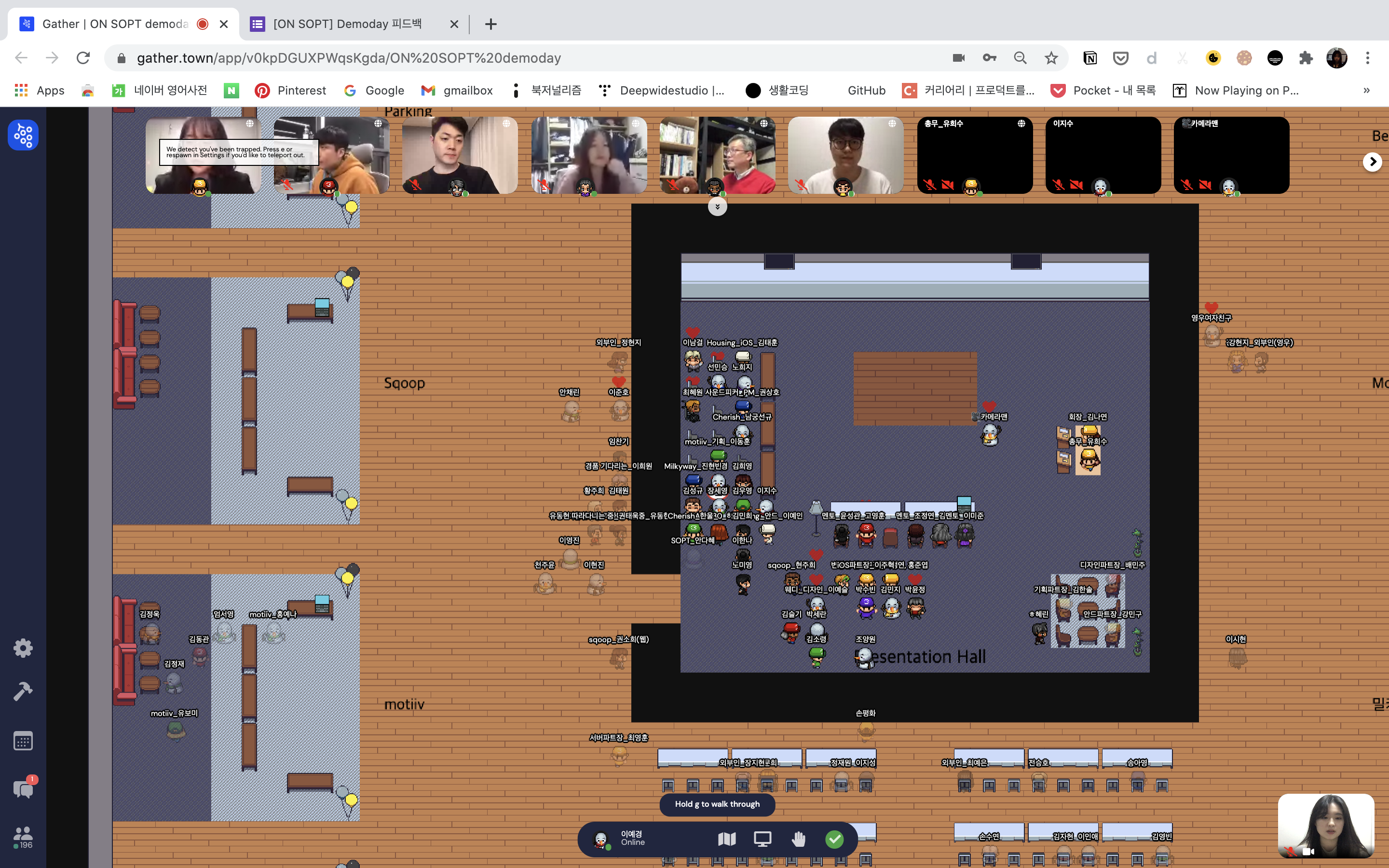 ์ง์ง๋ ํ ์์ผ, ๋ช ์ฃผ๊ฐ ํ์๋ค๊ณผ ๊ณ ๊ตฐ๋ถํฌํ๋ฉฐ ๋ง๋ค์ด์จ ์๋น์ค๋ฅผ ๋ฐํํ๋ ์จ๋ผ์ธ ๋ฐ๋ชจ๋ฐ์ด๊ฐ ์์๋ค. Gather.town์ ํ์ฉํด, 400๋ช ์ ๋ฌํ๋ ์ฌ๋๋ค์ด ์จ๋ผ์ธ ์์ ๋ชจ์ฌ, ๋ฐํ์ ํผ๋๋ฐฑ, ์๋น์ค ์์ฐ ๋ถ์ค ์ด์ ๋ฑ์ ์งํํ๋ค. ํ์ ์ ๊ณ์ IT ๊ธฐํ์, ๋์์ด๋, ๊ฐ๋ฐ์๋๋ค์ด ๋ฉํ ๋ก ์ฐธ์ฌํด์ฃผ์ จ๊ณ , ์ค๋ ์๊ฐ๋์ ๋ชจ๋ ํ๋ค์๊ฒ ๋ผ์ ์ด์ด ๋๋ ์ข์ ํผ๋๋ฐฑ์ ๋จ๊ฒจ์ฃผ์ จ๋ค. ์ฐ๋ฆฌ ํ์ ์๋น์ค์ ๋ํด์๋ ์ด์ ํฌ์คํ ์์๋ ์์ฑํ ๋ฐ ์๋ค.