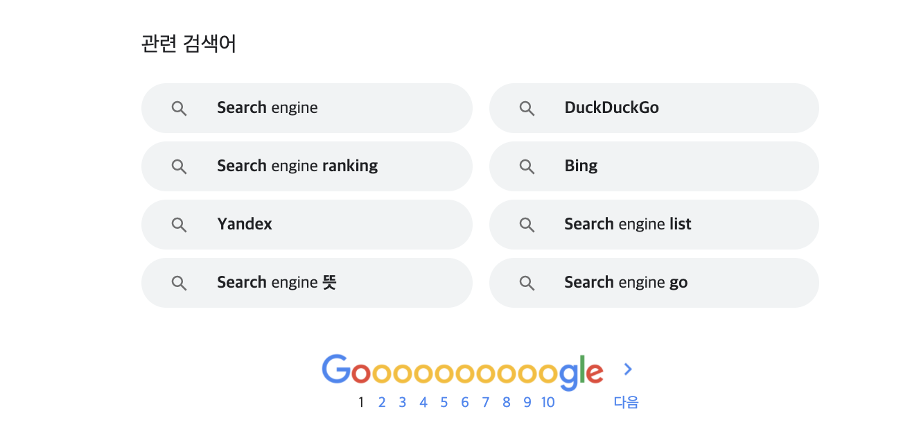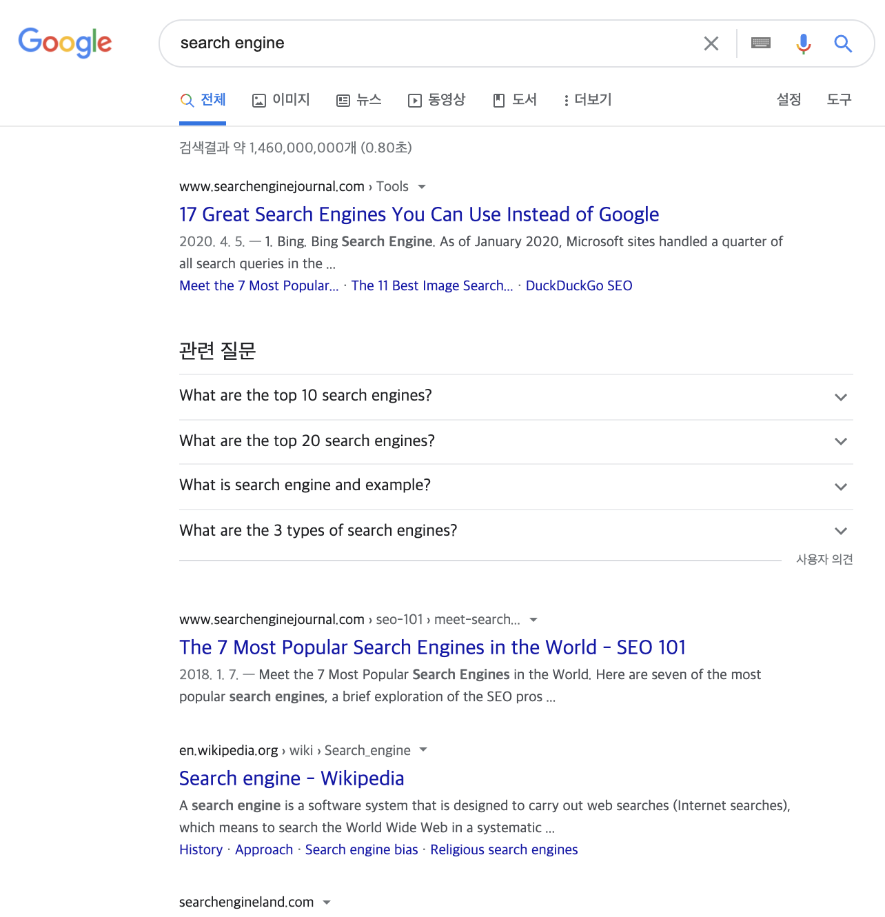 ๊ตฌ๊ธ์์ 'search engine'์ด๋ผ๋ ๊ฒ์์ด๋ฅผ ๊ฒ์ํ์, ์ ๋ชฉ, URL, ํ ์คํธ์ ์ฌ ๋ด์ฉ์ ํ์ด์ง ๋งํฌ๊ฐ ์๊ณ , ํด๋น ํ์ด์ง ๋ด์์ ๊ตฌ๊ธ์ด ๊ฐ์ฅ ์ต๊ทผ ์ ์ฅํ ํ์ด์ง๋ ์๋ค. ํ๋จ์๋ ์ฌ์ฉ์๊ฐ ๋์ค์ ์ฐพ์์ง ๋ชจ๋ฅด๋ ๊ด๋ จ ๊ฒ์์ด๋ ๋ณด์ธ๋ค.