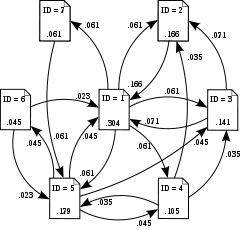 * ํ์ด์ง๋ญํฌ(PageRank)๋ ์๋ ์์ด๋ ์น๊ณผ ๊ฐ์ ํ์ดํผ๋งํฌ ๊ตฌ์กฐ๋ฅผ ๊ฐ์ง๋ ๋ฌธ์์ ์๋์ ์ค์๋์ ๋ฐ๋ผ ๊ฐ์ค์น๋ฅผ ๋ถ์ฌํ๋ ๋ฐฉ๋ฒ์ผ๋ก, ์น์ฌ์ดํธ ํ์ด์ง์ ์ค์๋๋ฅผ ์ธก์ ํ๊ธฐ ์ํด ๊ตฌ๊ธ ๊ฒ์์ ์ฐ์ด๋ ์๊ณ ๋ฆฌ์ฆ์ด๋ค.