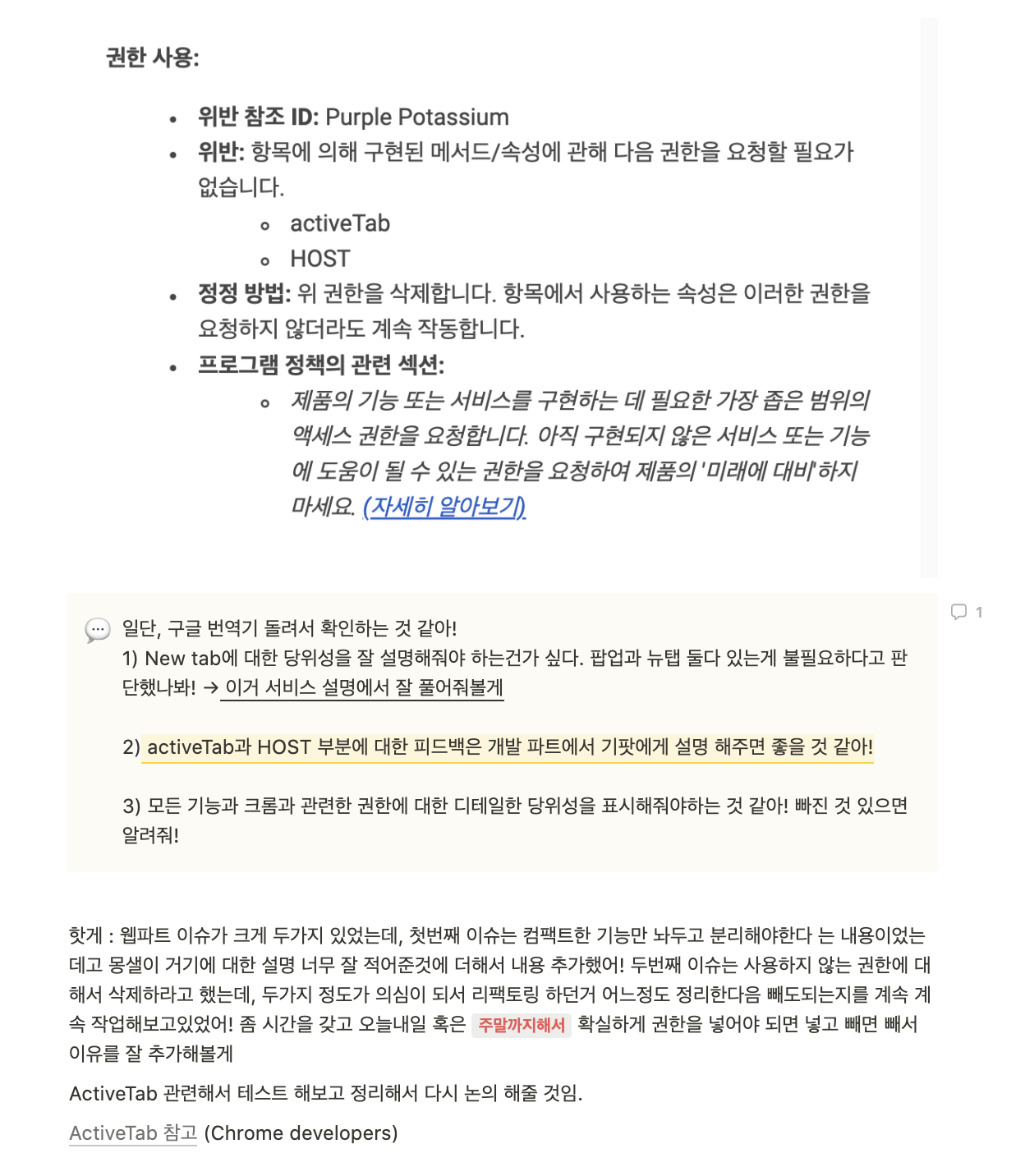 ์ฟ ํคํํน์ ํฌ๋กฌ์ต์คํ ์ ์ผ๋ก ๊ตฌ์ฑ๋ '์ง์๊ด๋ฆฌ ์๋น์ค'๋ค. ๋ค์ํ ๊ด์ฌ ์น ์ฝํ ์ธ ๋ค์ ํ๊ณณ์ ๋ชจ์ผ๊ณ , ์์ฝ๊ฒ ๋ถ๋ฅํด ์ ๋ฆฌํ ์ ์๋ค. ๋์๊ฐ, ๋ด๊ฐ ๋ชจ์ ์ง์๊ณผ ์ ๋ณด๋ฅผ ๊ธฐ๋ฐ์ผ๋ก ๋ค๋ฅธ ์ฌ๋๋ค๊ณผ ์ฐ๊ฒฐ๋ ์ ์๋ ์ง์ ์๋ณธ์ ์ฅ์ ๋ง๋ค์ด๋๊ฐ๊ณ ์ ํ๋ค. ์ต๊ทผ, ์ต์ ํต์ฌ ๊ธฐ๋ฅ์ ์ง๋ ์ฟ ํคํํน ๋ฒ ํ๋ฒ์ ์ ์ถ์ํ๋ค. ์ถ์๋ฅผ ์ํด, ํฌ๋กฌ์ผ๋ก๋ถํฐ ์ต์คํ ์  ์น์ธ์ ๋ฐ๋๋ฐ ์ ๋ง ์ง๋ํ ์ฌ์ ์ด ์์๋ค. ์ ๋ง 1์ ๋ง๋ถํฐ๋ ํฌ๋กฌ์น์คํ ์ด ์น์ธ๊ณผ์ ์ ์์ด์๋ค. ์ฐ๋ฆฌ ๊ฐ๋ฐ์๋ค์ด ์ง์  ๊ตฌ๊ธ ํฌ๋กฌ์ ๋ฉ์ผ๋ ๋ณด๋ด๊ณ ๋์์์ด ํผ๋๋ฐฑ ๋ฐ์ผ๋ฉฐ ๊ฐ์ ํด๋๊ฐ๋ค. ํ ๋ฒ์ ํผ๋๋ฐฑ์ ๋ฐ๊ธฐ๊น์ง๋ ์ต์ 3-10์ผ ์ ๋์ ์๊ฐ์ด ์์๋์๊ธฐ ๋๋ฌธ์, ์ผ์ ์ด ๋์ด์ ธ ๊ต์ฅํ ๋ต๋ตํ๋ ์๊ธฐ์ด๊ธฐ๋ ํ๋ค. ์ฒ์์๋ ์ฐ๋ฆฌ๊ฐ ์๋น์ค ์๊ฐ, ๊ถํ ์์ฒญ ํญ๋ชฉ ๋ฑ์ ๋ค์ ํ์ ํ๊ฒ ์์ฑํ์ฌ ๊ฑฐ๋ถ๋ฅผ ๋นํ๋ค. ํฌ๋กฌ์ต์คํ ์ ์ '๊ถํ' ์์ฒญ ๋ถ๋ถ์ ๊ฝค ๊น๋ค๋กญ๊ณ ์๋ฏผํ๋ค. ์ฐ๋ฆฌ ์๋น์ค์ ์ค๋ช ๊ณผ ์ฝ๋๋ฅผ ๊ฒ์ ํ, ์ฐ๋ฆฌ๊ฐ ์์ฑํ ์ค๋ช ๊ณผ ๋์กฐํ์ ๋ ํฉ๋นํ์ง ์์ ๊ถํ์ ๋ํด ์ญ์ ๋ฅผ ๊ถ๊ณ ํ๋ค. '๊ถํ'์ ๋ํ ์ค๋์ด ํ์ํ๋ค. ์๋ฅผ ๋ค์ด, ์ฟ ํคํํน ์๋น์ค์์ ์นํด๋ฆฌํ ํด๋ ์ฝํ ์ธ ๋ฅผ ํฌ๋กฌ ์น๋ธ๋ผ์ฐ์  '์ ํญ'์ ์ด ๋๋ง๋ค ํ์ธํ ์ ์๋๋ก ํด๋์๋ค. ์ฌ๊ธฐ์ ๊ธฐ์ ์ ์ฅํด๋๊ณ ๋, ๋ ์์ ์ ๋ณด์ด๋ฉด ์ํ๊ฒ ๋๋ ์ํฉ์ ๋ง๊ธฐ ์ํด ์ ๊ทผ์ฑ์ ๋์ด๋ ค๋ ์๋๋ก ๊ธฐํ๋์๋ค. ์ด๋ฅผ ์ํด '์ ํญ'์ ๋ํ ๊ถํ์ ์์ฒญํ๋๋ฐ, ์ด๋ฐ ๊ธฐํ ์๋๋ฅผ ๊ตฌ์ฒด์ ์ผ๋ก ๋ช ์ํ์ง ์์์๋ค. ๊ทธ๋ฌ๋๋ ๋ค์๊ณผ ๊ฐ์ ๊ฑฐ์  ๋ฉ์์ง๋ฅผ ๋ฐ์๋ค.