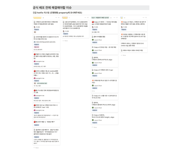 ์น์คํ ์ด ์น์ธ ์ดํ์ ๋ด๋ถ QA๋ฅผ ์งํํ ๋๋, Notion์ ์นดํ ๊ณ ๋ฆฌ/์๋๋ฆฌ์ค๋ณ๋ก Column์ ๊ตฌ๋ถํ๋ค. ๊ทธ๋์ ์ด์๊ฐ ์๊ธธ ๋๋ง๋ค, ํด๋น cloumn ํ๋จ์ ์ด์๋ฅผ ๊ธฐ๋กํ๊ณ '์ค์๋, UX/GUI ๋ฑ ์์ญ ๊ตฌ๋ถ, ์๊ตฌ์ฌํญ' ๋ฑ์ ํ๊ธฐํ๋ค.