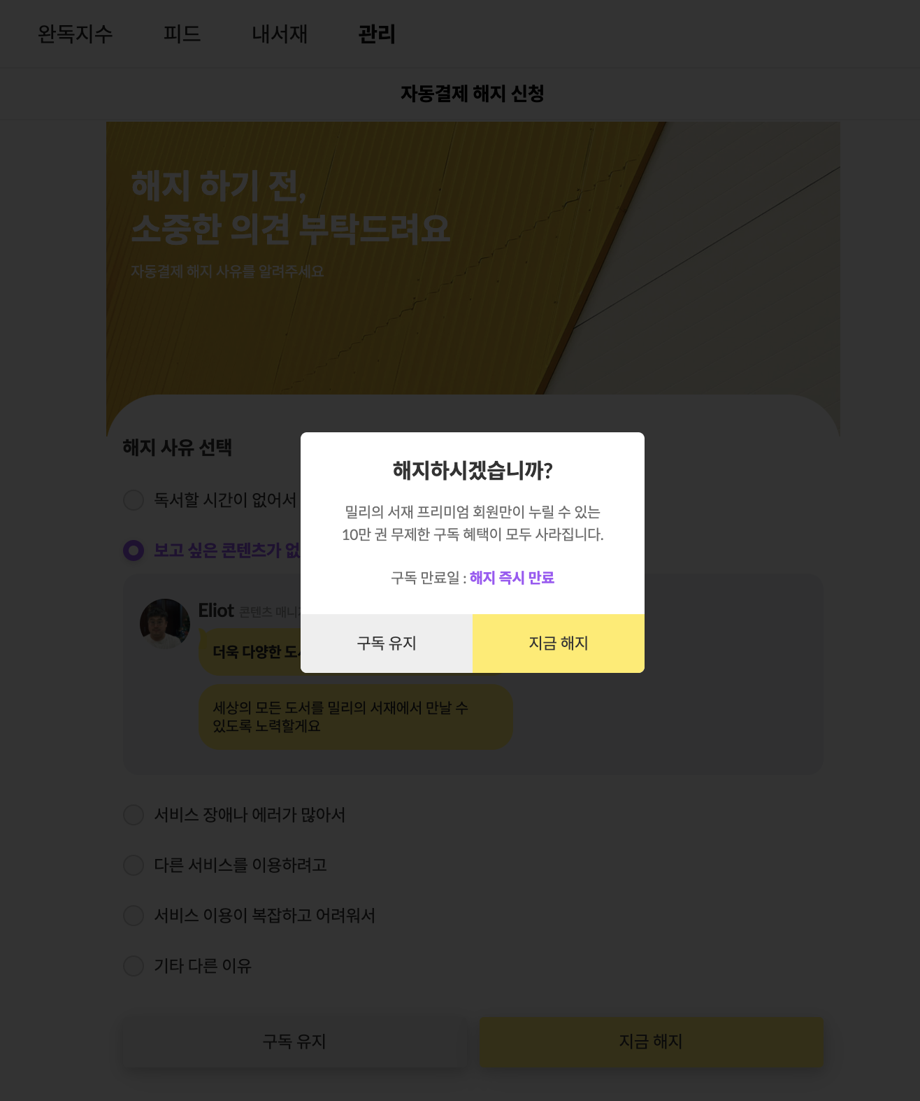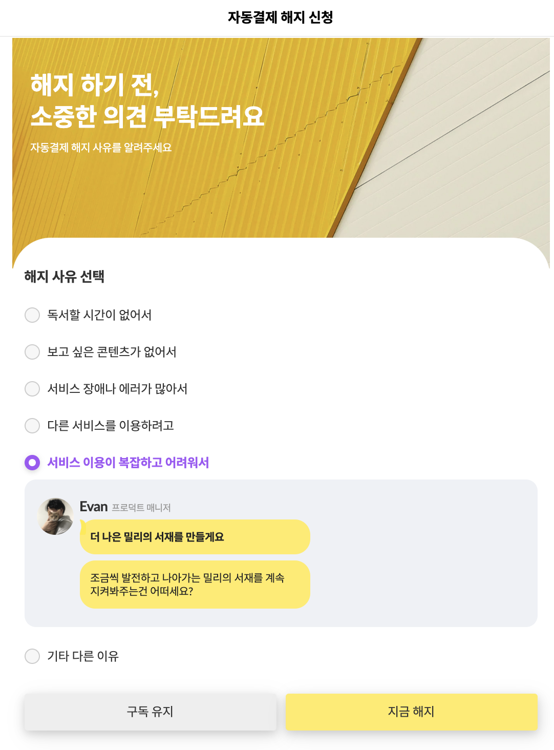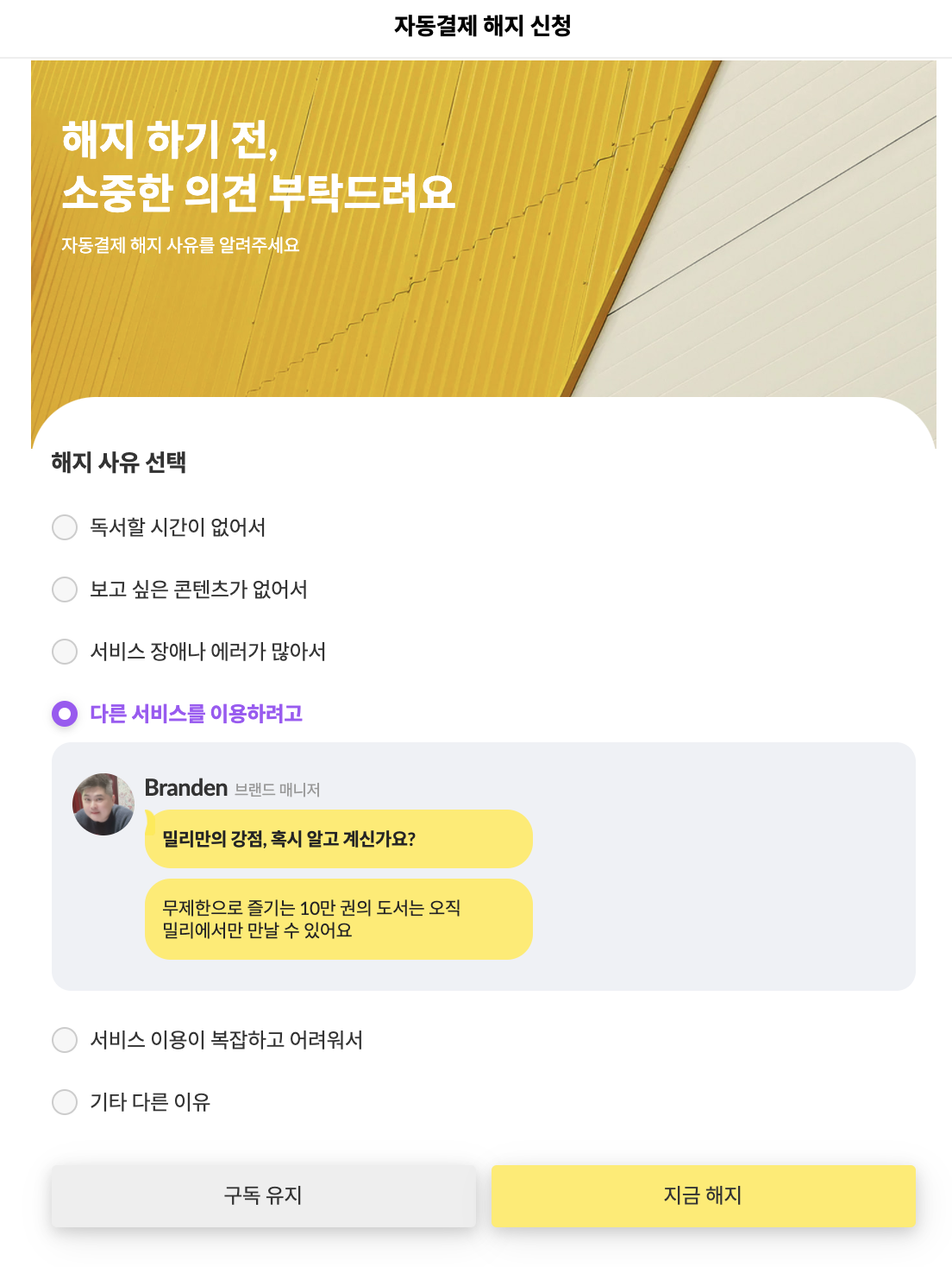 ๋ด๊ฐ ์ฌ๋ฏธ์๊ฒ ๋ณด์๋ ๋ถ๋ถ์ ๋ฐ๋ก ํ๋จ์ 'ํด์งํ๊ธฐ ์ ์์คํ ์๊ฒฌ์ ๋ถํ๋๋ ค์' ๋ถ๋ถ์ด์๋ค. ์ฌ๋งํ ์๋น์ค๋ค์ ๋ชจ๋ ํํด/ํด์ง ์ ์ ํผ๋๋ฐฑ์ ์๊ตฌํ๋ค. ์ธ์๊น์๋ ๋ถ๋ถ์, ํด์ง ์ฌ์ ๋ฅผ ์ ํํ๋ฉด ๋ฐ๋ก ๊ดํ ๋ฉค๋ฒ์ chat ํํ์ ๋ฉ์์ง๊ฐ ๋ฑ์ฅํ๋ค. ์๋ ๋ฏ์ ์นจ ๋ชป ๋ฑ๋๋ค๊ณ , ํ๋กํ ์ฌ์ง๊ณผ ๋๋ค์/์งํจ๊ณผ ํจ๊ป ํด์ง ์ ๊ณ ์์ฒญ ๋ฉ์์ง๋ฅผ ๋ฐ๋ ๊ฒฝํ์ด ์ ์ ํ๋ค. ๊ถ๊ธํด์ ์ ํ์ง๋ค์ ํ๋์ฉ ๋ค ๋๋ฌ๋ดค๋ค. ๊ทธ๋ผ์๋ ํ๋จ์ '์ง๊ธ ํด์ง'๋ฅผ ํด๋ฆญํ๋ฉด '์ด๋ฌํ ํํ์ด ์์ด, ๊ทธ๊ฒ ๋ชจ๋ ์ฌ๋ผ์งํ ๋ฐ ๊ทธ๋๋ ํด์งํ๊ฒ ๋?'๋ ์ตํ์ ๋ณ๋ก ์ ํ๋ค.