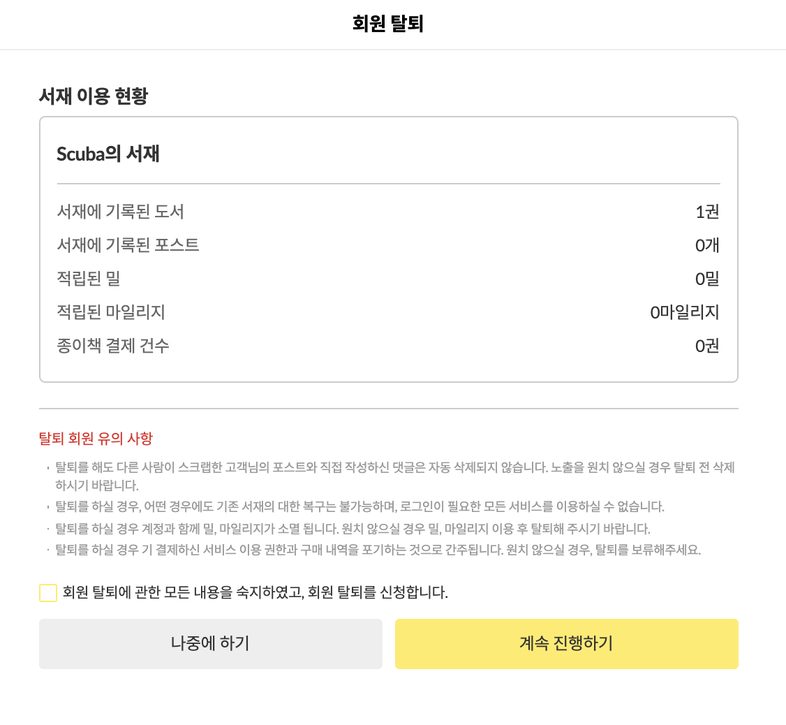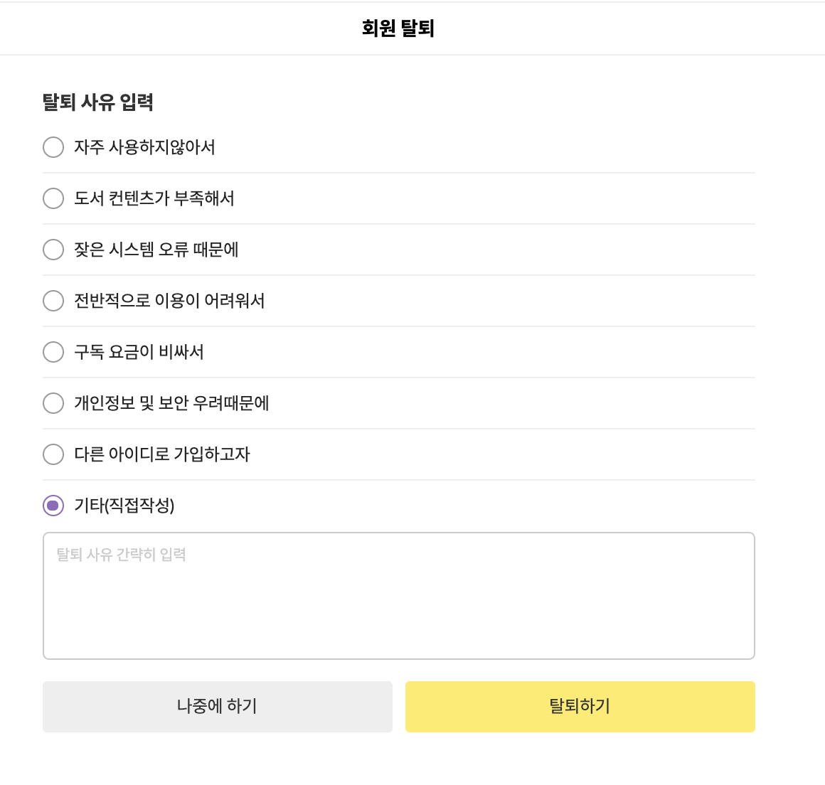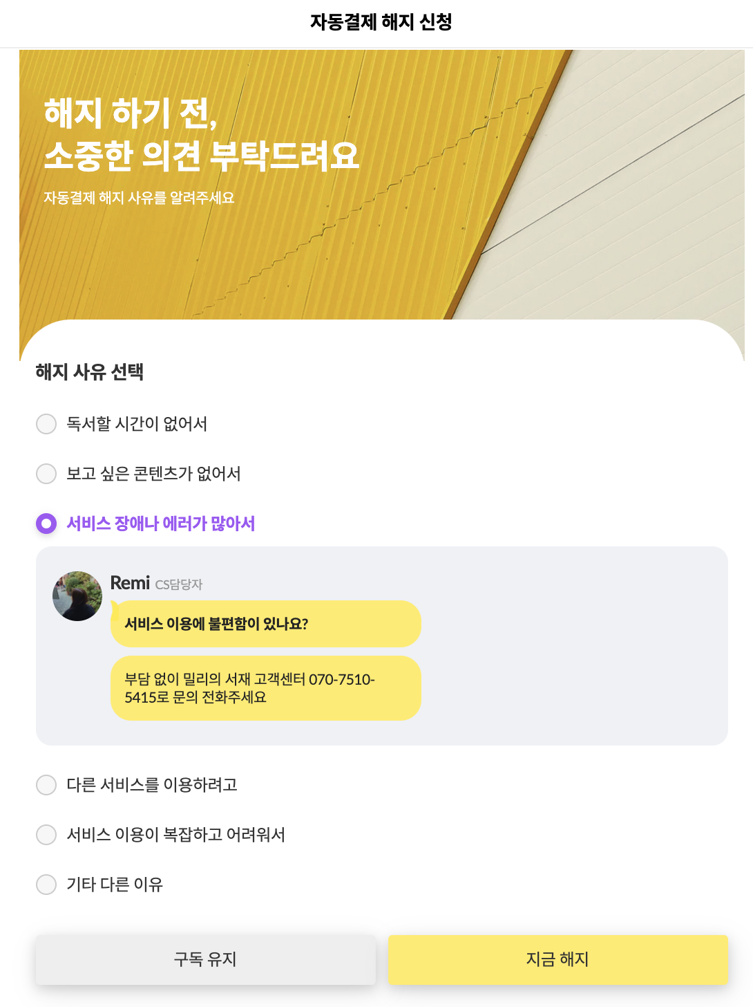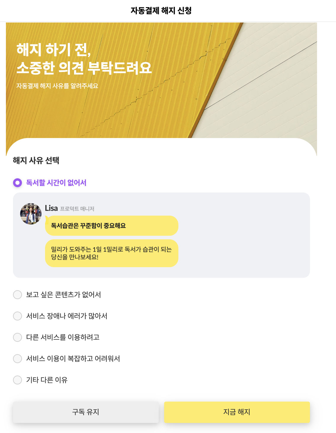 ๋ด๊ฐ ์ฌ๋ฏธ์๊ฒ ๋ณด์๋ ๋ถ๋ถ์ ๋ฐ๋ก ํ๋จ์ 'ํด์งํ๊ธฐ ์ ์์คํ ์๊ฒฌ์ ๋ถํ๋๋ ค์' ๋ถ๋ถ์ด์๋ค. ์ฌ๋งํ ์๋น์ค๋ค์ ๋ชจ๋ ํํด/ํด์ง ์ ์ ํผ๋๋ฐฑ์ ์๊ตฌํ๋ค. ์ธ์๊น์๋ ๋ถ๋ถ์, ํด์ง ์ฌ์ ๋ฅผ ์ ํํ๋ฉด ๋ฐ๋ก ๊ดํ ๋ฉค๋ฒ์ chat ํํ์ ๋ฉ์์ง๊ฐ ๋ฑ์ฅํ๋ค. ์๋ ๋ฏ์ ์นจ ๋ชป ๋ฑ๋๋ค๊ณ , ํ๋กํ ์ฌ์ง๊ณผ ๋๋ค์/์งํจ๊ณผ ํจ๊ป ํด์ง ์ ๊ณ ์์ฒญ ๋ฉ์์ง๋ฅผ ๋ฐ๋ ๊ฒฝํ์ด ์ ์ ํ๋ค. ๊ถ๊ธํด์ ์ ํ์ง๋ค์ ํ๋์ฉ ๋ค ๋๋ฌ๋ดค๋ค. ๊ทธ๋ผ์๋ ํ๋จ์ '์ง๊ธ ํด์ง'๋ฅผ ํด๋ฆญํ๋ฉด '์ด๋ฌํ ํํ์ด ์์ด, ๊ทธ๊ฒ ๋ชจ๋ ์ฌ๋ผ์งํ ๋ฐ ๊ทธ๋๋ ํด์งํ๊ฒ ๋?'๋ ์ตํ์ ๋ณ๋ก ์ ํ๋ค.