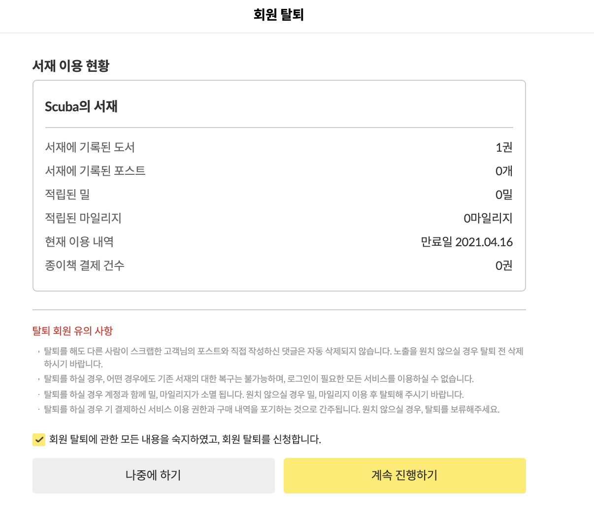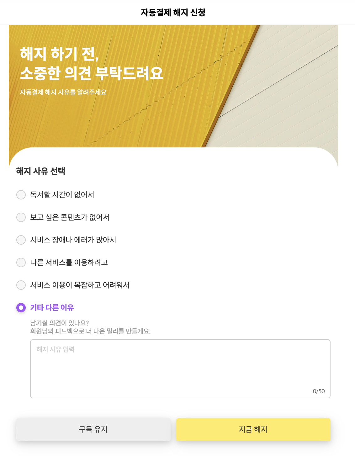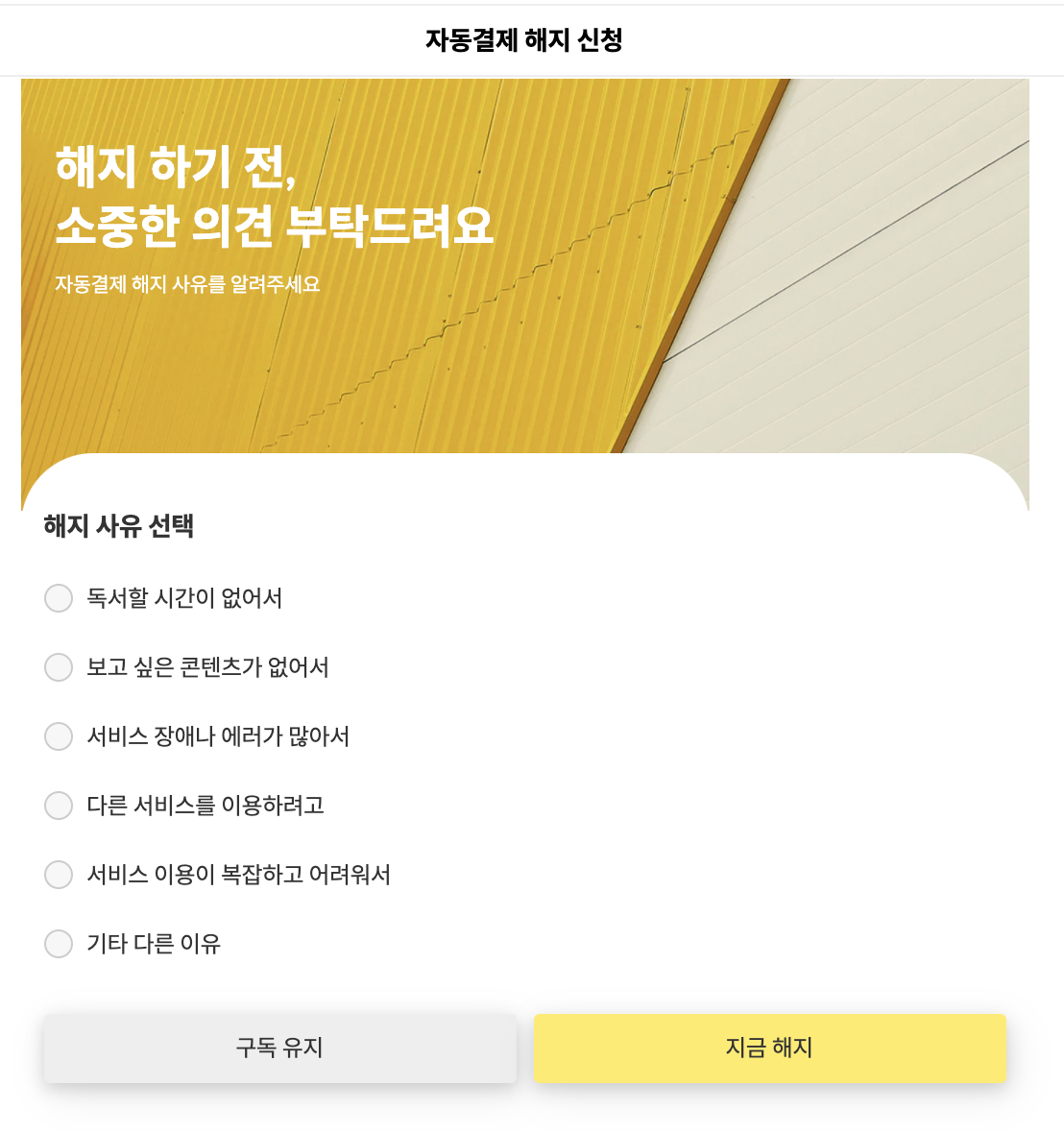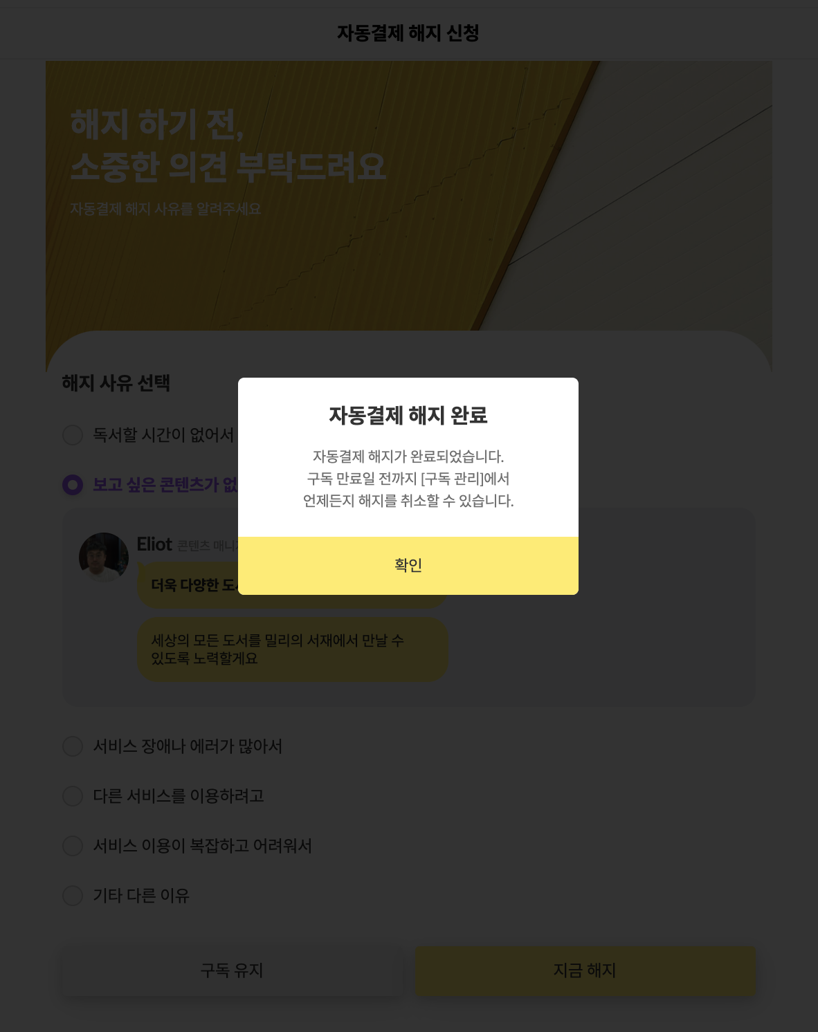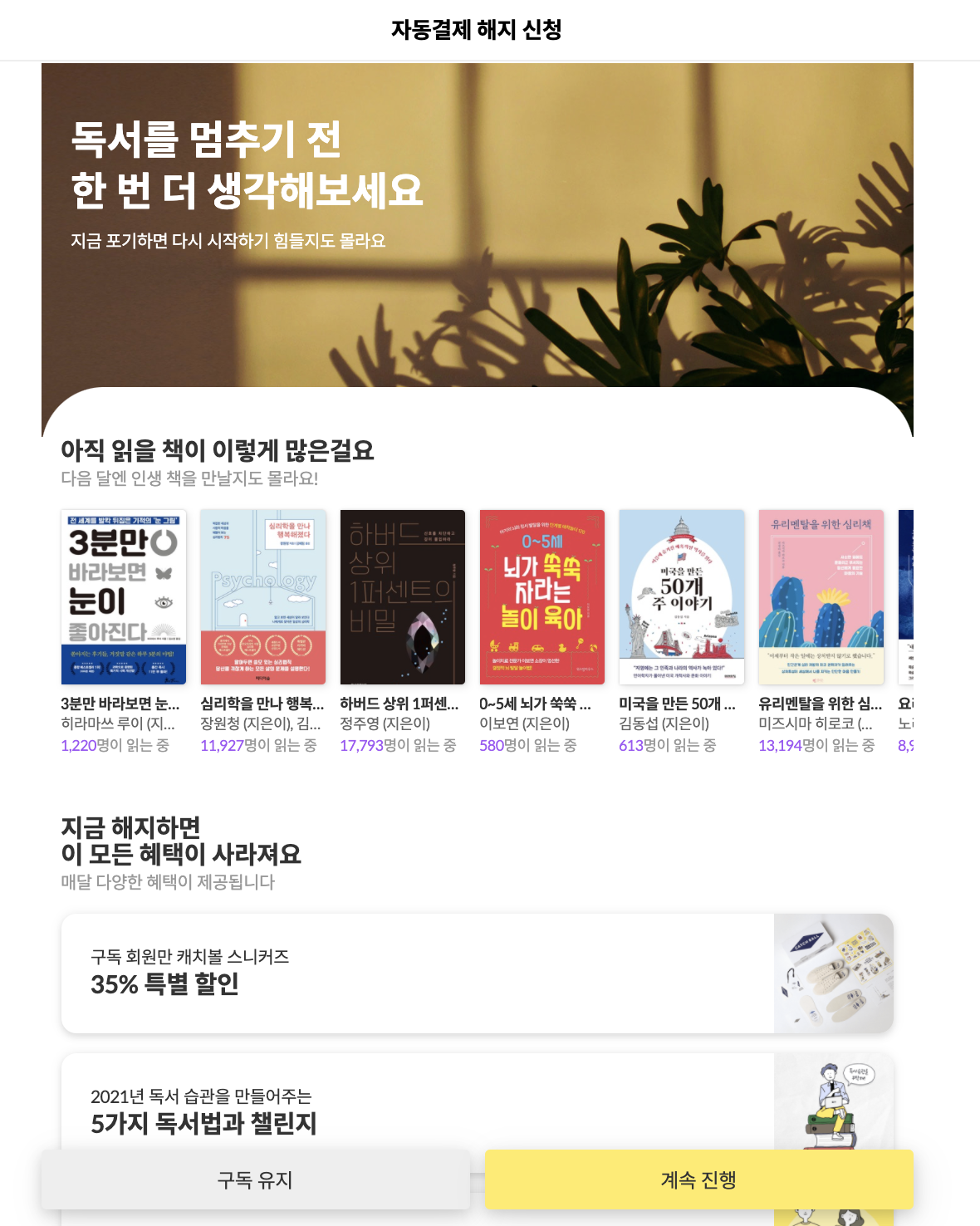 ํด์ง๋ฅผ ์๋ฃํ๊ณ ๋๋ฉด, ๊ตฌ๋ ๋ง๋ฃ์ผ ์ ๊น์ง ์ธ์ ๋ ์ง ํด์ง๋ฅผ ์ทจ์ํ ์ ์๋ค๊ณ ์ค๋ช ํ๋ค. ๊ทธ๋ฆฌ๊ณ ์์ฐ์ค๋ฝ๊ฒ '์๋๊ฒฐ์ ํด์ ์ ์ฒญ' ํ์ด์ง๋ฅผ ๋์์ค๋ค. 'ํด์ง ์ทจ์'๊ฐ ์ ํ์๋ ๋ณด๋ผ์ ๋ฒํผ์ด ๋์ ๋๋ค.