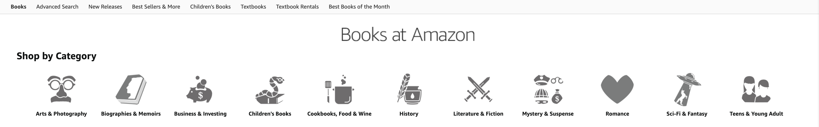 1) Art & Photograpy, 2) Biographies & Memoirs, 3) Business & Investing 4) Childrens'Books, 5) Cookbooks, Food & Wine, 6) History, 7) Literature & Fiction, 8) Mystery & Suspense, 9) Romance, 10) Sci-Fi & Fantasy, 11) Teens & Young Adult