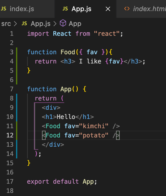 - ๋ฆฌ์กํธ๋ index.js์์ ํ๋์ ์ปดํฌ๋ํธ๋ง renderํด์ค ์ ์๊ธฐ ๋๋ฌธ์, ์๋ก์ด Component๋ index.js๊ฐ ์๋, Component์์ ์จ์ฃผ๊ธฐ