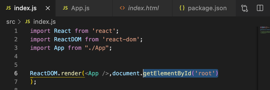- index.js์ ReactDom.render์์ <App />๋ ๋ฐ๋ก App.js๋ฅผ ์๋ฏธํ๋ ๊ฒ.