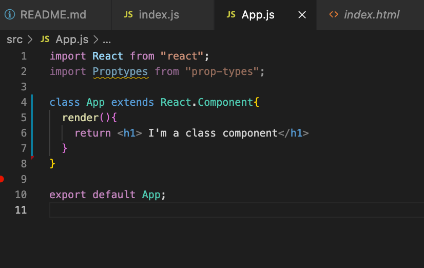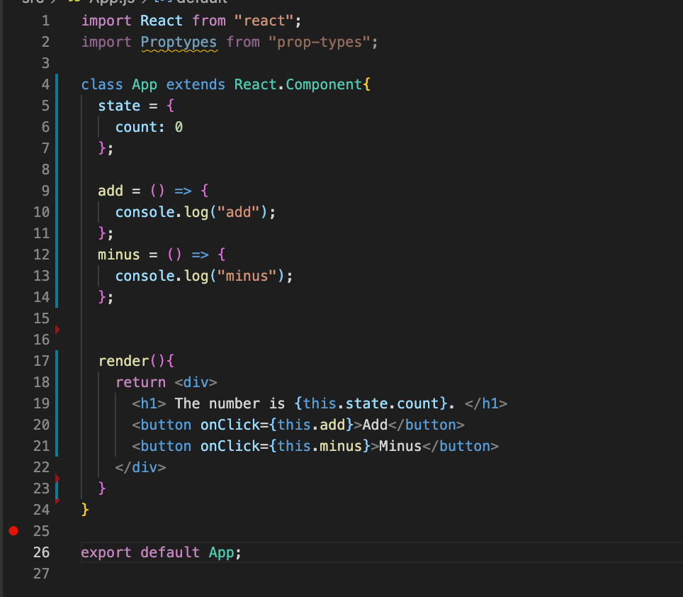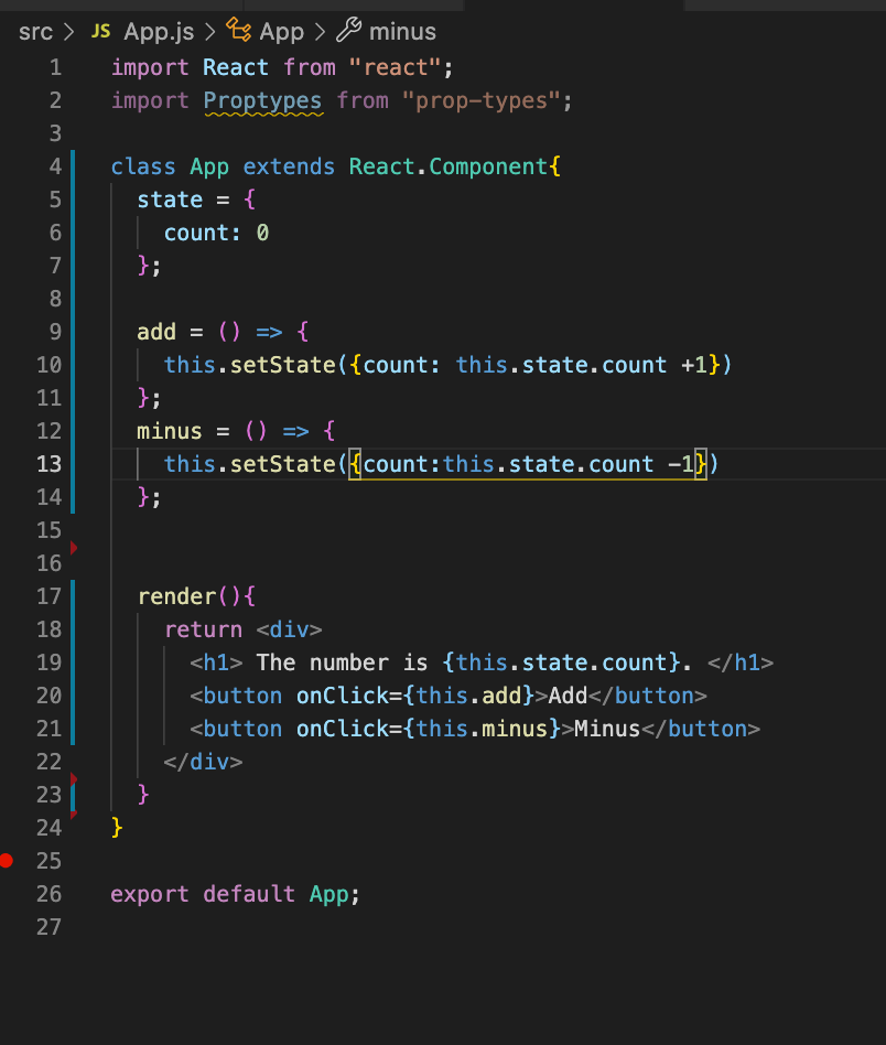 - state๋ฅผ ์ฐ๊ธฐ ์ํด์๋, class component ํํ๋ฅผ ์ฌ์ฉํด์ค์ผํ๋ค. (์์์ ํ๋ ๊ฒ์ function component. class component์ function component์๋ ์ฐจ์ด๊ฐ ์๋ค.)