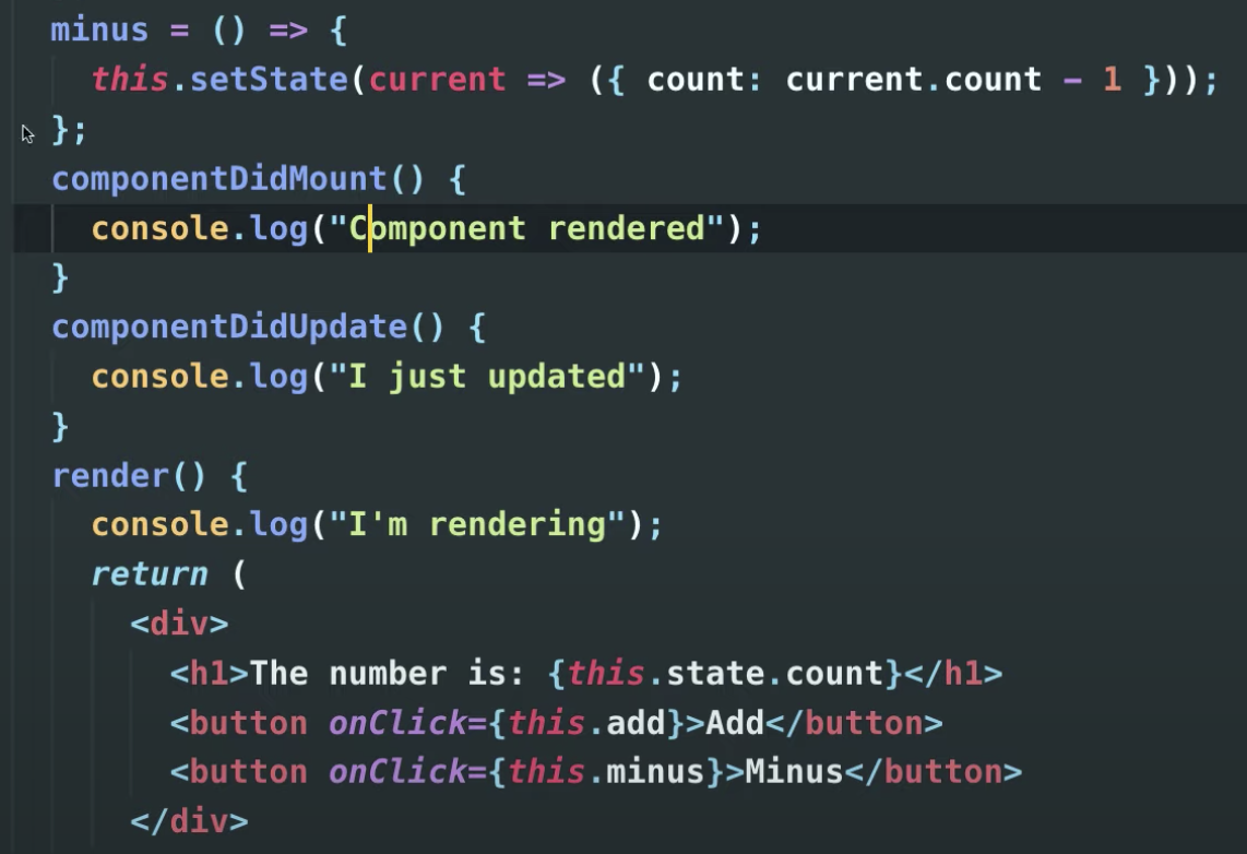 - setState({}) : state๋ฅผ ๋ฐ๊พธ๊ณ ์ถ๋ค๋ฉด, setState๋ฅผ ์ฌ์ฉํ๋ค. ์๋ก์ด ๋ฐ์ดํฐ๋ฅผ ์์์ refreshํ๊ณ , render function์ refreshํด ํ์ํด์ค๋ค.