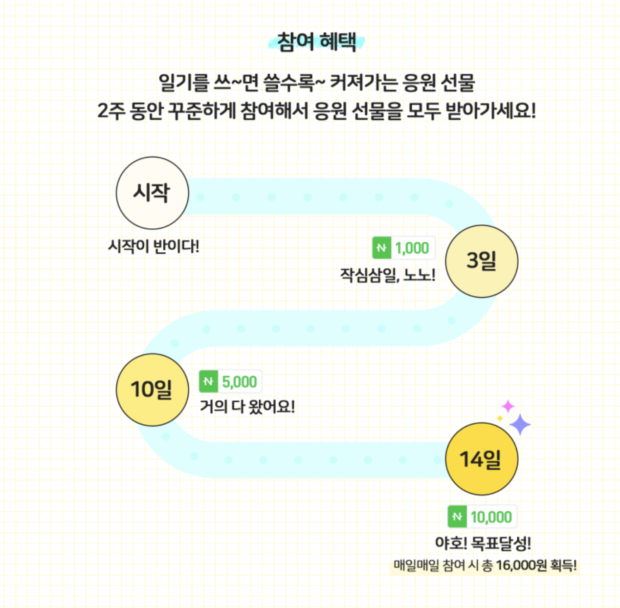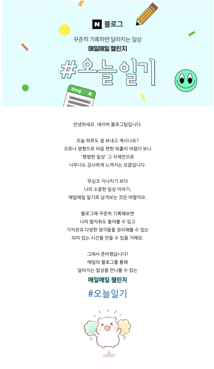 ๋ค์ด๋ฒ๋ ์ง๋ 5์ 1์ผ๋ถํฐ 14์ผ๊น์ง 2์ฃผ์ผ ๋์ ๋ค์ด๋ฒ ๋ธ๋ก๊ทธ์ ๊ธ์ ์ฌ๋ฆฐ ๋ชจ๋ ์ด์ฉ์์๊ฒ ๋ค์ด๋ฒํ์ด 1๋ง6000์์ ์ง๊ธํ๋ โ๋งค์ผ๋งค์ผ ์ฑ๋ฆฐ์ง #์ค๋ ์ผ๊ธฐโ๋ผ๋ ์ด๋ฒคํธ๋ฅผ ์งํํ๋ค. 3์ผ์ ์ฑ์ฐ๋ฉด 1000์, 10์ผ์ด ๋๋ฉด 5000์, 14์ผ๊น์ง ๊ณ์ ๊ธ์ ์ฐ๋ฉด ์ถ๊ฐ๋ก 1๋ง์์ ์ง๊ธํ๋ ์์ด๋ค. ์ด ๊ฐ์ ํฌ์ธํธ๋ ๋ค์ด๋ฒํ์ด ์๋น์ค์ ๊ฐ์
