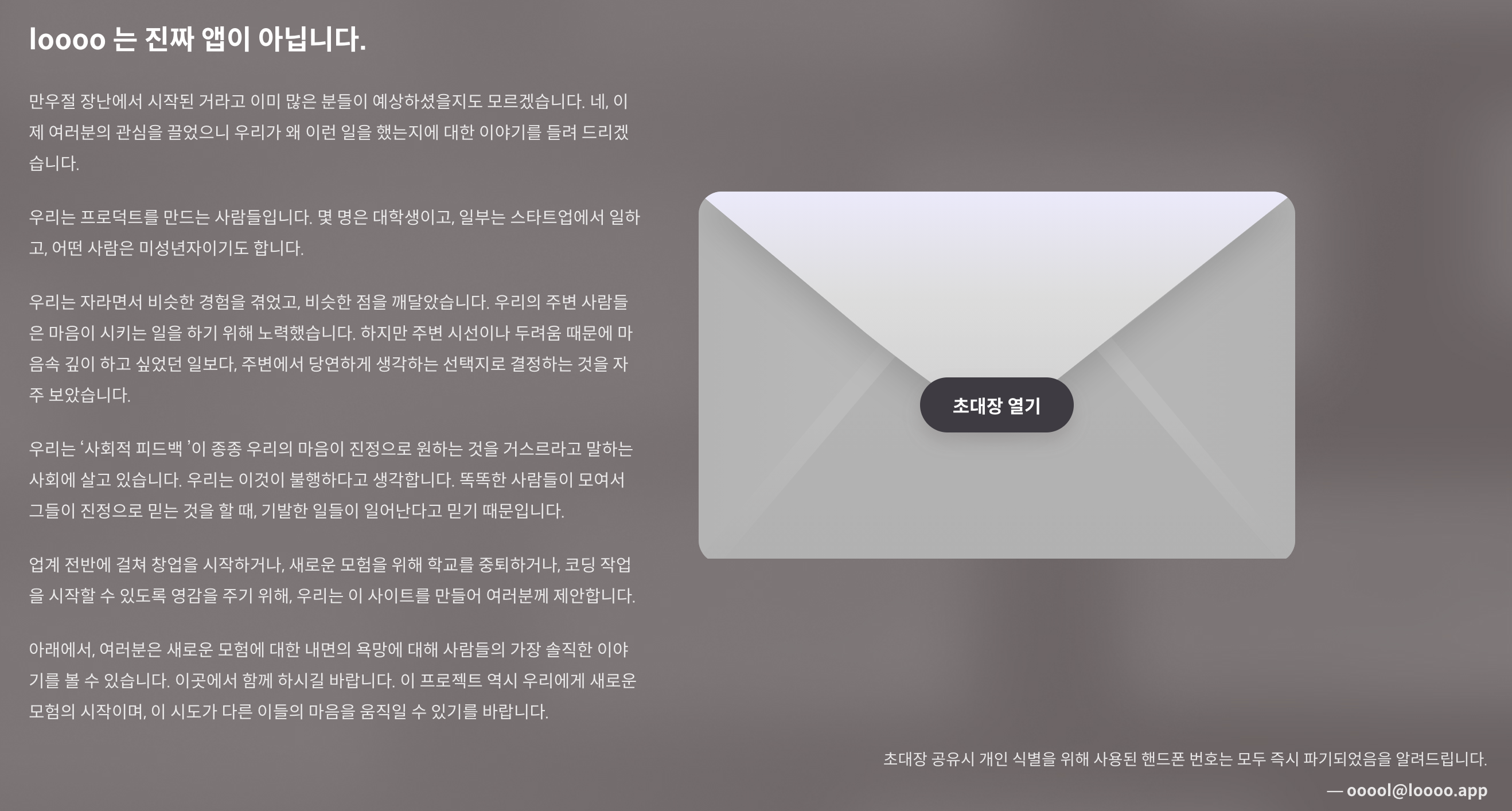 ๋ง์ฐ์ ์ดํ, loooo๋ ์ง์ง ์ฑ์ด ์๋๋ฉฐ, ์ผ์ข ์ ํ๋ก์ ํธ์ฑ ์ด๋ฒคํธ์๋ค๋ ๊ธ์ด ๊ฒ์ฌ๋์๋ค. ์ด๋ฅผ ๋ณด๊ณ , ํ์๋น ๋ด์์ ์์ฌ์๊ณผ ์ฐ๋ ค, ๋ถ์พ๊ฐ์ ํํ๋ ๋ง์ ์๊ฒฌ๋ค์ด ์ค๊ฐ๋ค. ํนํ, ํด๋น ์๋ด ํ์ด์ง์๋ ์ ๊ณตํ๋ ๊ฐ์ธ์ ๋ณด์ ๋ํด์๋ ์ด๋ป๊ฒ ํ๋ค๋ ์๋ด๊ฐ ๋์ค์์ผ ์ถ๊ฐ๋์๋ค. ์์ง ๋น์ ๋์๋ฅผ ์ฑ๊ธฐ๊ฑฐ๋, ์ด๋ป๊ฒ ํ๊ธฐํ ๊ฒ์ธ์ง์ ๋ํ ์ฝ๊ด ๋ช ์๊ฐ ์์ด์ผํ๋๋ฐ ์ผ๋ฐฉ์ ์ผ๋ก ๊ฐ์ธ์ ๋ณด ์ ๊ณต๋ง ํ๊ฒ ๋์ด์ ์ฐ์ฐํ๋ค๋ ์๊ฒฌ๋ ์์๊ณ , ํด๋น ์ ๋ณด๋ฅผ ์ ์ฉํ ํผ์ฑ ๋ฉ์ธ์ง ๋ฑ์ ์ํ์ฑ์ผ๋ก ์ฐ๊ฒฐ๋ ์ ์์ด ๋ถ์ํ๋ค๋ ์๊ฒฌ, ์ฌ๊ณผ ๋ฉ์์ง ๋ถ์ฌ์ ๋ํ ๋ถ์พํจ, ๋ฌด์จ ๋ฉ์์ง๋ฅผ ์ ๋ฌํ๋ ๊ฑด์ง ์ ๋ชจ๋ฅด๊ฒ ๋ค, ์ง์ธ๋ค์๊ฒ๋ ์ด๋์ฅ์ ๋๋ ์คฌ๋๋ฐ ์์ฐจ ์ถ์๋ค ๋ฑ์ ์ด์ผ๊ธฐ๊ฐ ์์๋ค. ๊ฐ์ธ๋ค์ ๊ฐ๋ฒผ์ด ์ฌ์ด๋ ํ๋ก์ ํธ ์ ๋์๋๋ผ๋, ๊ฐ์ธ ์ ๋ณด๋ฅผ ์์งํ๋ ๋งํผ ์ ์์๋ค์ ์ ๋ณด๋ณด์์ ๋ํ ์ฑ ์๊ฐ์ด ํ์ํ๋ฉฐ, ํฅ๋ฏธ๋ฅผ ์ ๋ฐํ๋ ์ด๋์ฅ์ผ๋ก ์ฌ๋๋ค์ ๋์ด๋ค์ธ ์ด๊ฐ์ ๋ฐฉ์์ ์ค๋ฆฌ์ ์ธ ๊ณ ๋ฏผ์ด ํ์ํ ์ง์ ์ด๊ธฐ๋ ํ๋ค. loooo.app ํ๋ก์ ํธ๋ ์ด๋ฌํ ๋ฌธ์ ๋ฅผ ์ ๊ธฐํ๋ ์์ฃผ ๋จ์ ์ธ ์๋ผ๊ณ ์๊ฐํ๋ค.