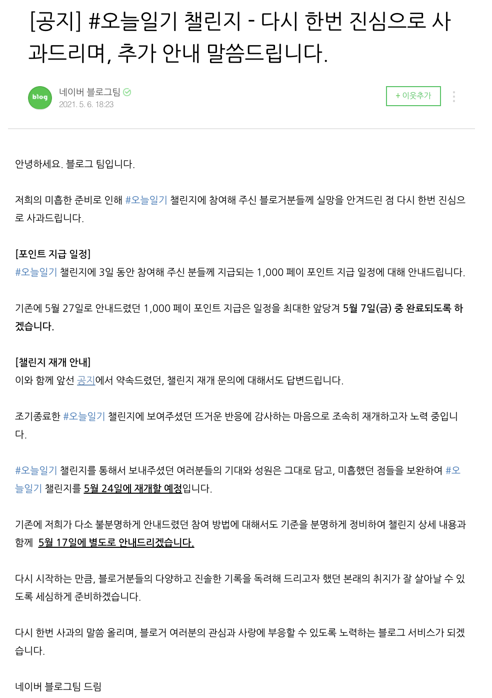 ์ฅ๋ฌธ์ ๋ค์ ๋์ผ๋, ์ฌ๋ก ์ด ๊ฐ๋ผ์์ง ์์๋ค. ๋ค์ ์ดํ ํ ๋ค์ด๋ฒ ๋ธ๋ก๊ทธ๋ '[๊ณต์ง] #์ค๋์ผ๊ธฐ ์ฑ๋ฆฐ์ง - ๋ค์ ํ๋ฒ ์ง์ฌ์ผ๋ก ์ฌ๊ณผ๋๋ฆฌ๋ฉฐ, ์ถ๊ฐ ์๋ด ๋ง์๋๋ฆฝ๋๋ค.' ๋ผ๋ ์ ๋ชฉ์ ์ถ๊ฐ ์๋ด ์
