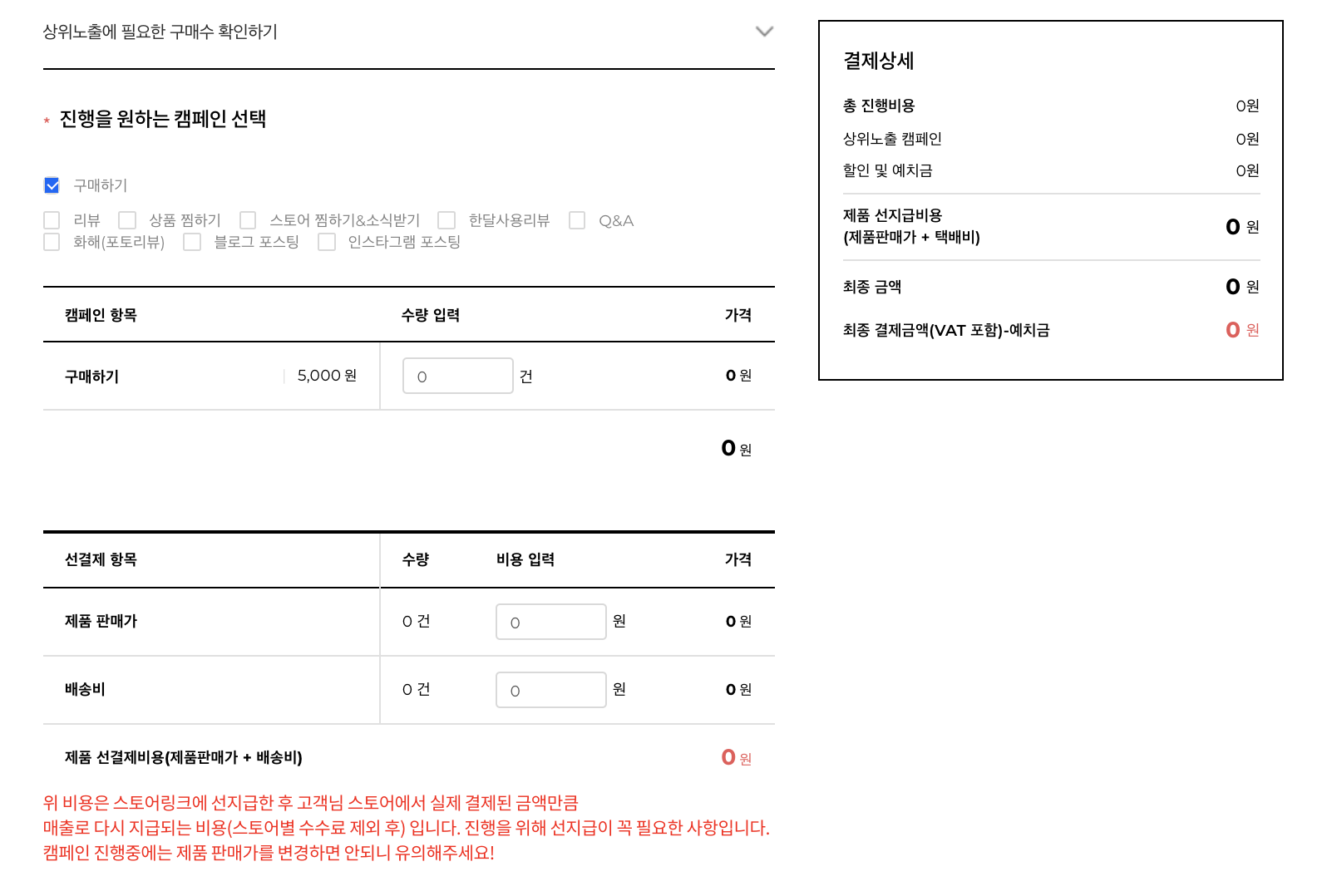 ๊ฐ๊ฐ์ ํญ๋ชฉ์ ๋ํด ๋ช๊ฐ ์๋์ ์์ ์ ์งํํ ๊ฒ์ธ์ง์ ๋ฐ๋ผ ๊ฐ๊ฒฉ์ด ์ฐ์ ๋๋ฉฐ, ์ํ๋ ์๋๋งํผ์ ๋ฐฐ์ก๋น ํฌํจ ์ ํ๊ฐ๋ฅผ ์ ์ ๊ธ ํด์ผํ๋ค. ์ฒดํ๋จ์ด ์ง์ ํด๋น ์คํ ์ด์์ ๊ฒฐ์ ๋ฅผ ํ๊ฒ ๋๋ฏ๋ก, ์ ์ ๊ธํ๋ ์ ํ๊ฐ๋ ๋งค์ถ๋ก ๋ค์ ์ง๊ธ๋ฐ๊ฒ ๋๋ ํ์์ด๋ค. ์ฆ, ์๋ขฐ์๋ ๊ฑด๋น ์บ ํ์ธ ๋น์ฉ๊ณผ ๊ฒฐ์ ๊ฑด๋น ๋ถ๋ ์คํ ์ด๋ณ ์์๋ฃ๋ฅผ ๋ถ๋ดํ๊ฒ ๋๋ค.