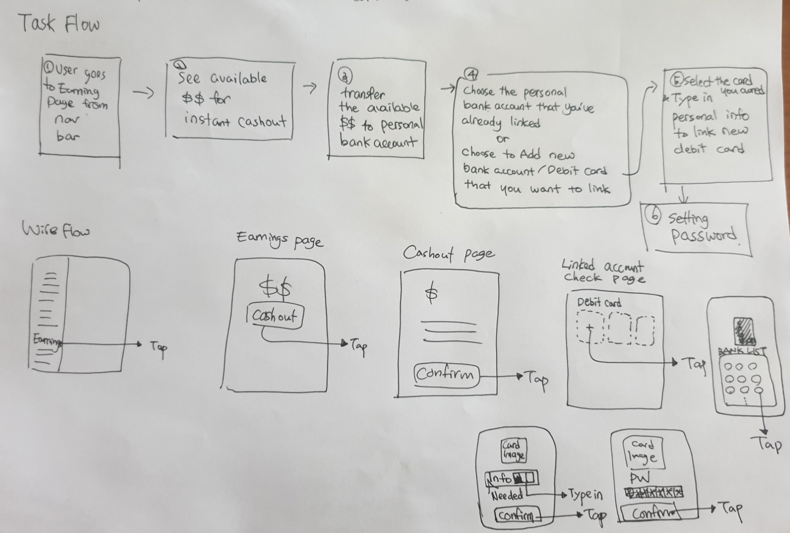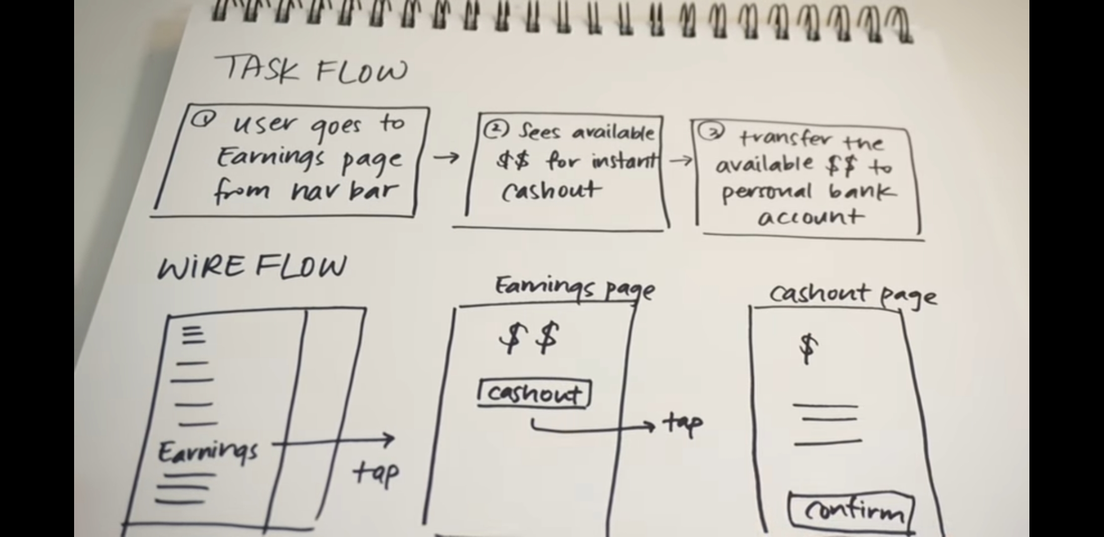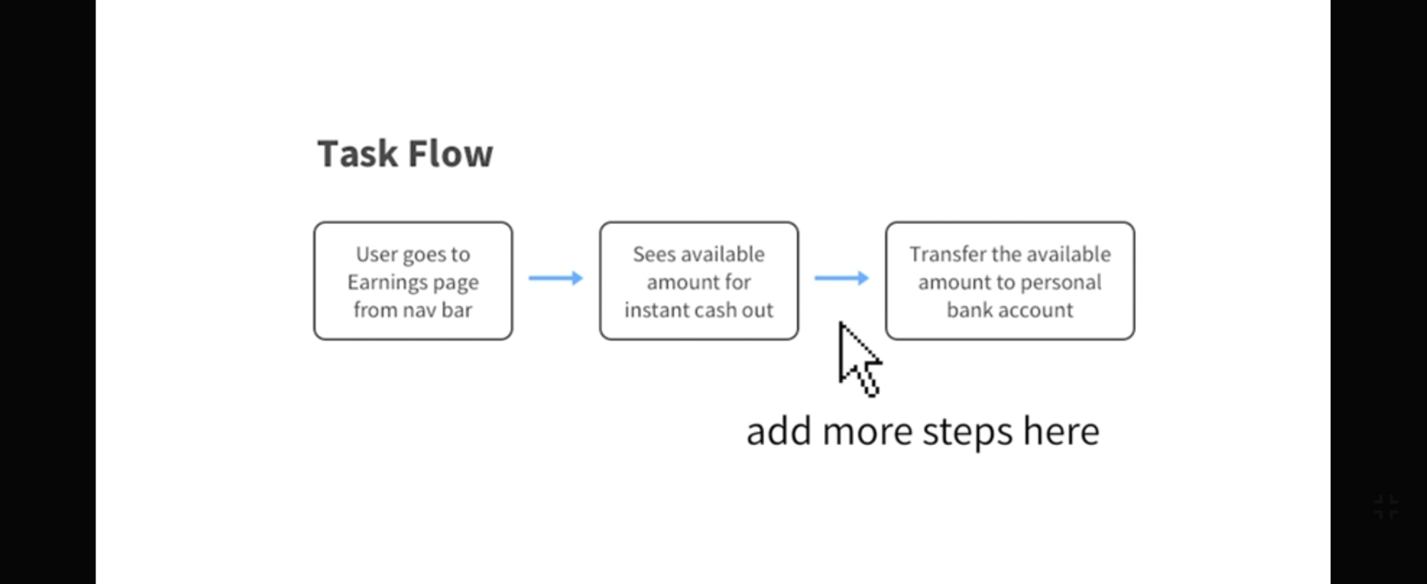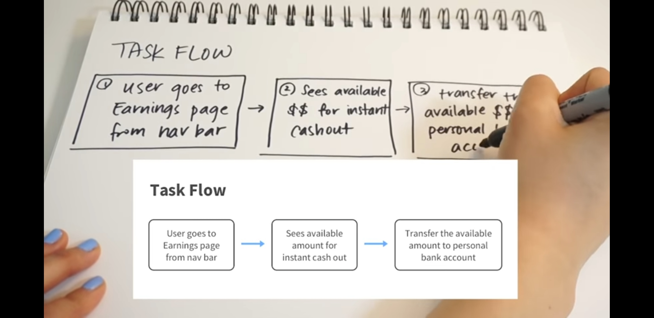 ์ ์ง๋ฌธ์ ๋ํ ๋ต์ ์์์ผ๋ก Task Flow๋ฅผ ๊ทธ๋ ค๋ณธ๋ค. ์์์์๋, Shopper๊ฐ ์ฑ ์์ ๋ค์ด๊ฒ์ด์ ๋ฐ์์ 'Earnings page'๋ฅผ ๋๋ฅด๋ ๊ฒ์์ ์์๋๋ค๊ณ ๋ณด์๋ค. ์ด๋ ๊ฒ ์ฌ์ฉ์๊ฐ ์ด๋ค ๊ณผ์ ์ ๊ฑฐ์ณ์ ๋ชฉํ๋ฅผ ๋ฌ์ฑํ๊ฒ ๋๋์ง ํผ์ง ํผ์งํ๊ฒ Task๋ค์ ์์๋๋ก ์ ์ด๋ณธ๋ค. (์ด ์์์์๋ ์ง๋ ํฌ์คํ ์ User Flow Diagram์์ ์ฌ์ฉํ๋ ์ง์ฌ๊ฐํ, ๋ค์ด์๋ชฌ๋ ๊ฐ์ ๋ชจ์์ ๊ตฌ๋ถ์ด ํ์ ์์ ๋ง์ด ์ฌ์ฉ๋์ง๋ ์๋๋ค๊ณ ํจ์คํ๋ค.)