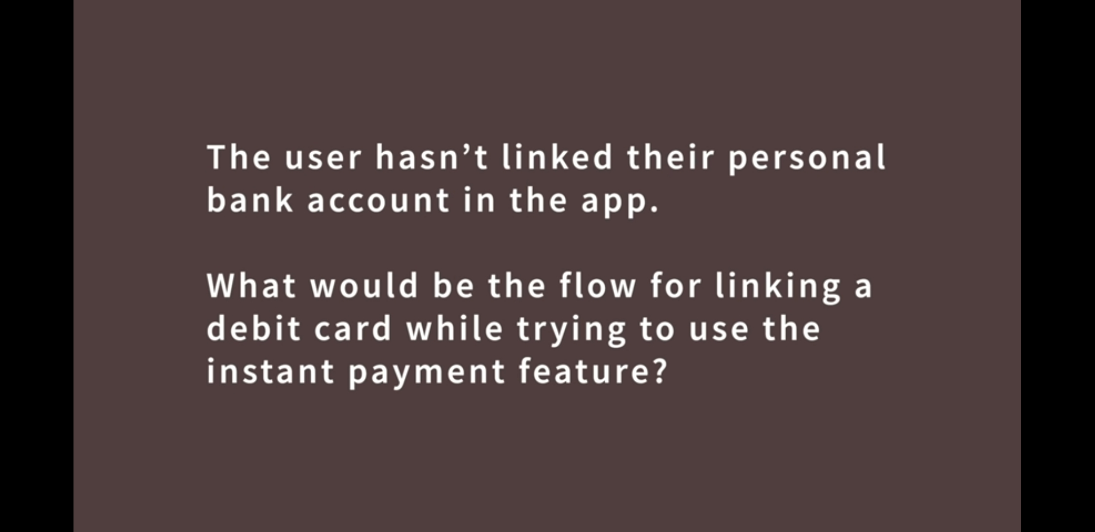 1. ๋จผ์ ๋ค์, User์ ์ต์ข ๋ชฉํ๋ฅผ ํ์ธํ๋ค. "์์์ ๋ง๋ Instant Payment Feature ๊ณผ์ ๋ด์์, Debit Card ์ฐ๋ํ๊ธฐ"๋ผ๊ณ ์ ๋ฆฌํ๋ค.