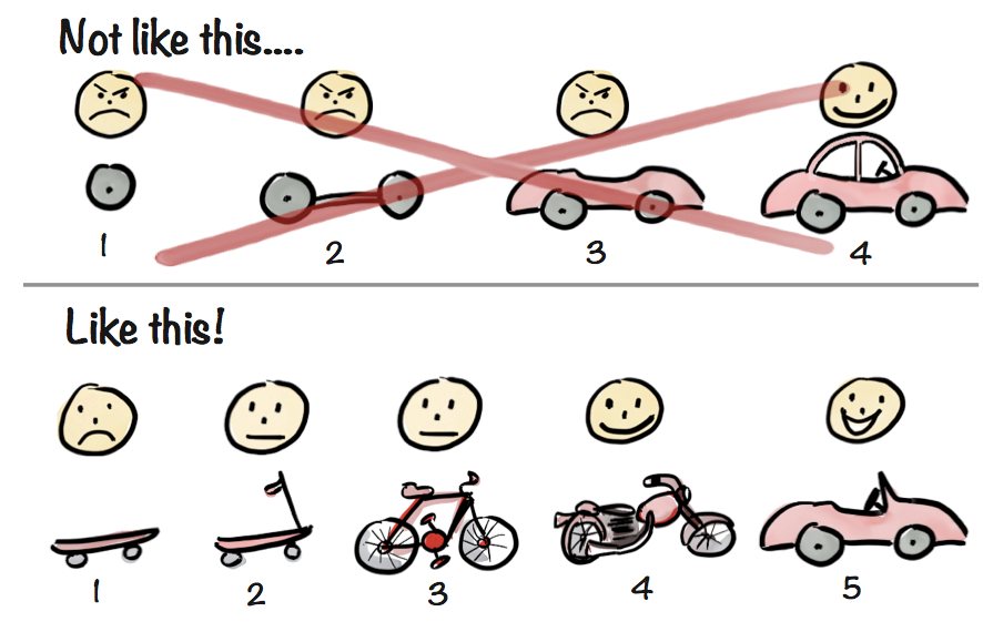 ๊ณผ ๋ง์ผ์ ์์ด๋์ด๋ฅผ ๊ธฐ๋ณธ์ผ๋ก ํ๋ค. ๊ฐ๋ฐํด์ผ ํ ์์ด๋์ด์ ์ด์ ์ ๋ง์ถ๋ค๋ ์๊ฐ๊ณผ๋ ๋ฌ๋ฆฌ, ์ ์์ผ์ ์ฐ์ ๋์ ๊ฐ์น ํน์ง์ ์ด์ ์ ๋ง์ถ๋ค. ์ฆ, ํ ๋ฒ์ ์ ์ฒด๋ฅผ ์ ๋ฌํ๋ ค ํ์ง ์๊ณ , ๋งค๋ฒ ๋ฐ๋ณต์ ๊ฑฐ์ณ ๊ตฌ์ฒด์ ์ด๊ณ ์คํ ๊ฐ๋ฅํ ๊ฒฐ๊ณผ๋ฅผ ์์ฐํ๋ ๊ฒ์ด๋ค. ์๋ฅผ ๋ค์ด, ํ๋์ ์ฑ์ ๋ก ์นญํ๋ค๊ณ ํ์ ๋ ๋ชจ๋ ๊ธฐ๋ฅ์ ๋ค ํ์ฌํ ์ฑ์ ํ๋ฒ์ ๋ง๋๋ ๊ฒ์ด ์๋๋ผ, ์๋น์ค ์ ๊ณต์ ๊ฐ์ฅ ํต์ฌ์ ์ธ ๊ธฐ๋ฅ๋ถํฐ ํ๋์ฉ ๋ง๋ค์ด์ testํ๊ณ ํฉ์น๊ณ ๋ฐ์ ์ํค๊ณ ํ๋ ๊ณผ์ ์ด๋ผ๊ณ ์ดํดํ๋ค.
