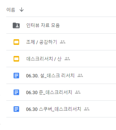 ์ด๋ ์ฐ๋ฆฌ๋ ํ๋ฃจ๋ง์ ๋์์ธ ์ฝํน์ ๋ชจ๋ ๋จ๊ณ๋ฅผ ์งํํ๊ณ ์ ํ๋๋ฐ, ์์ํ๋ ์๊ฐ๋ณด๋ค ๋ง์ด ๋๋ ์ด๊ฐ ๋์๋ค. ์ญ์ ํ๋ฃจ๋ง์ ์ํํ๊ธฐ์๋ ๋ค์ ์ด๋ ค์์ด ์๋ค๋ ์๊ฐ์ด ๋ค์๋ค. ๋น์ฅ ๊ณต๊ฐ ๋์์ ์ฐพ์ ์ธํฐ๋ทฐ๋ฅผ ๋ ๋๋ ๊ฒ์ด ์ด๋ ค์์, ์ฐ๋ฆฌ๋ ์ผ๋จ ๋ฐ์คํฌ๋ฆฌ์์น๋ฅผ ์งํํ๊ธฐ๋ก ํ๋ค. ์๊ฐ์ ์ธํ ํด ๊ฐ์ ๊ตฌ๊ธ ๋ฅ์ค์ ์๊ธฐ ํ์ผ์ ๋ง๋ค๊ณ , ๊ทธ๊ณณ์ ๋ฆฌ์์น๋ฅผ ์งํํ๋ค.