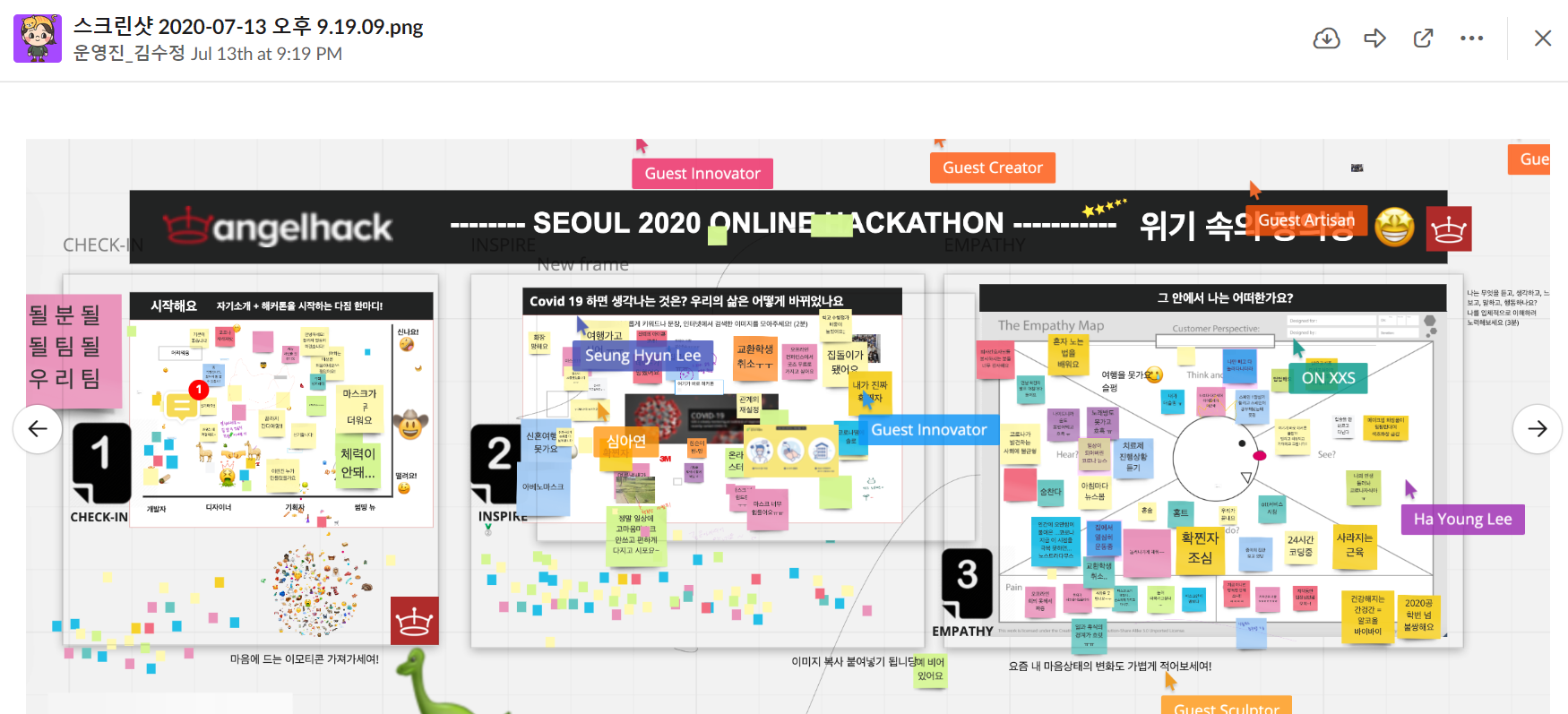 ๋ค์๋ , ์ฐ๋ฆฌ ํ์ ๋ณธ๊ฒฉ์ ์ผ๋ก ํด์ปคํค์ ์์ํ๊ธฐ ์ํด ๋ชจ์๋ค. ์ฌ์ค ๋ค๋ฅธ ํ๋ค์, slack์์ ์ฒ์ ํ๋น๋ฉ์ ํ๊ณ ์จ๋ผ์ธ์ผ๋ก ํ์๋ฅผ ์งํํ๋ ํ๋ค์ด ๋ง๊ฒ ์ง๋ง, ์ฐ๋ฆฌ๋ ์คํ๋ผ์ธ์ผ๋ก ๋ชจ์๋ค. ๊ทธ๋ฆฌ๊ณ ์ง๋ ๋์์ธ์ธ์ ์์ ๊ต์ฅํ ์ธ์๊น์๋ ๋ฏธ๋ก๋ณด๋๋ฅผ ์ด์ฉํด์, ์์ ๋ก์ด ์์ด๋์์ด์ ์ ํจ๊ป ํด๋ณด๊ธฐ๋ก ํ๋ค. 5๊ฐ์ ์ฃผ์ด์ง ๋์ ๊ณผ์ ๋ฐ์๋ค๊ฐ, ํด๋น ์ฃผ์ ์ ์ฐ๊ด๋ ์์ ๋ก์ด ์์ด๋์ด ํฌ์คํธ๋ฅผ ๋ถ์ด๊ธฐ๋ก ํ๋ค. ํจ๊ป ๋ณด๋ฉด ์ข์ ์๋ฃ๋ค์ ์์๋ค ๋ถ์ด๊ณ , ๋ฌ๊ณ ์ถ์ ์ฝ๋ฉํธ๋ ํ์ดํ๋ฅผ ๋ฌ์ ์ถ๊ฐํ๋ฉฐ ์ ์ฝ ์์ด ์์ด๋์ด๋ฅผ ๋ฐ์ฐํ๋ ๊ณผ์ ์ ๊ฑฐ์ณค๋ค. ๋ฐ์ฐ์ ๊ณผ์ ์ ํ ๋ฒ ๊ฑฐ์น ๋ค์, ํ๊ด ๋ณ ์คํฐ์ปค๋ฅผ ๋ง๋ค์ด์, ๊ฐ์ ๋ง์์ ๋๋ ์์ด๋์ด์๋ค๊ฐ ๋ณ์ ๋ถ์ฌ์ฃผ๊ธฐ๋ก ํ๋ค. ๋ญ๊ฐ ์ง๊ด์ ์ผ๋ก ๋ฐ๋ก๋ฐ๋ก ์ฌ๊ณ ์ง์ฒ๋๊ฐ ๋์ ๋ณด์ด๊ณ , ํฌ๋ก์ค์ฒดํฌ ํ ์ ์์ด์ ํจ์จ์ด ๊ทน๋ํ๋๋ ๊ธฐ๋ถ์ด์๋ค. ๋ณํ๊ฐ ๋ถ์ ์์ด๋์ด์ ๋ํด ์์ ๋กญ๊ฒ ์๊ฒฌ์ ์ฃผ๊ณ ๋ฐ๊ณ , ์ง๋ฌธ ์ด ์๋ค๋ฉด ์ง๋ฌธํ๊ณ , ๋ ๋ณํ๊ฐ ๋ถ์ ๊ฑฐ ์ธ์ ๋ณธ์ธ์ด ์ข ๋ ์ดํํ๊ณ ์ถ์ ์์ด๋์ด๋ฅผ ์ดํํด๋ณด๋ ์๊ฐ์ ๊ฐ์ก๋ค.