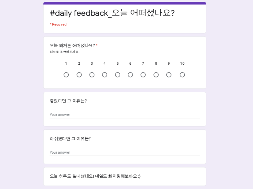 ๊ทธ๋ฆฌ๊ณ ์ด ์ผ์ฃผ์ผ์ด๋ผ๋ ํด์ปคํค์ ์๊ฐ์ด, ์ง์์ ์ผ๋ก ์๋ฏธ์๋ ์๊ฐ์ด ๋ ์ ์๋๋ก ์ด๋ฐ ์์๋ก ํํ๋ก์ ํธ๋ฅผ ์งํํ๋ฉด ์ข๊ฒ ๋ค๊ณ ์๋ ค์ฃผ์ จ๋ค. ํน ์ผ์ฃผ์ผ ์์ ๋๋จํ ์ฑ๊ณผ๋ฌผ์ ๋ง๋ค์ด ๋ด์ง ๋ชปํ ์ง๋ผ๋, '์ฌ์ฉ์์์ ์์'ํ์ ๋์๋ ํด์ปคํค ์ดํ์๋ ๋ญ๊ฐ๋ก ์ด์ด์ง ์ ์๋ ์ข์ ์์ด๋์ด์ ์จ์์ด ๋ ์ ์๋ค. ๋ชฉํ์ ์์ ์์ํ๋ผ๋ ๊ฒ์, ์ฐ๋ฆฌ๊ฐ ๊ฟ๊พธ๋ ์์ฑ์์ ๋ชจ์ต์ ๋ํ ์ผํ๊ฒ ์์ํด๋ณด๋ฉฐ ๊ฐ๋ณด๋ผ๋ ๊ฒ์ด๋ค! ์ฐ๋ฆฌ ์๋น์ค๊ฐ ์ง๊ธ์ ๋ฏธ๋นํ ํ๋กํ ํ์ ์ ๋ ๋ง๋๋ ๊ฒ์ด ์ผ์ฐจ์ ์ธ ๋ชฉํ์ผ์ง๋ผ๋,,,