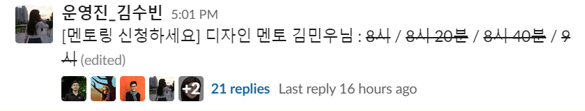 μμ €ν΅ ν΄μ»€ν€ μ£Όκ° λμ, μ΄λ° μμΌλ‘ λ©ν λλ€κ» λ©ν λ§ μ μ²μ ν μ μλ€. μ°λ¦¬λ μ΄λ μ€λ νμ λμ μ΄μ§ κ°νΌλ₯Ό λͺ» μ‘λ μ€, μ! 1:1 λ©ν λ§μ΄ μμμ§? νκ³ λ©ν λ§ κΈ°νκ° μλ€λ μ¬μ€μ λ μ¬λ Έλ€. μ¬μ€ λκ° μ€λΉλ μνμμ μ§λ¬Έμ ν΄μΌν κ² κ°μμ§λ§.. λ§μ°ν μ§κΈ λ©ν λ§μ ν΅ν΄ λκ° μ’μ μ‘°μΈμ λ°μλ³Ό μ μμ§ μμκΉ νλ μκ°μ νλ€. λ°μ ΈμΌ λ³Έμ μ΄λΌλ μκ°μΌλ‘, μ°λ¦¬λ μ€λ μ°Έμ¬ν μ μλ λ©ν λ§μ μ°Ύμ보기 μμνλ€.