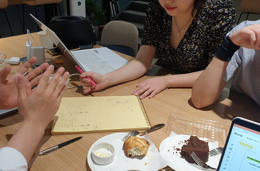 μ°λ¦¬λ κΈνκ² μ리λ₯Ό μ‘κ³ , λΉμ₯ μ§κΈκΉμ§ μ°λ¦¬κ° λ Όμν΄μλ λ€μ£½λ°μ£½μ μν©μ 볡기ν΄λ³΄μλ€. λΉμ₯ μ°λ¦¬μ μμ΄λμ΄λ₯Ό μ€λͺ ν΄μΌνλ€λ μκ°μ κΈ΄μ₯μ΄ μλ© λ€μ΄κ°λ€. μ°λ¦¬μ μμ΄λμ΄μ λͺ©μ , νκ³ μ νλ λ¬Έμ , λ©μμ§ λ±μ λΉ λ₯΄κ² μ 리ν΄λ³΄μλ€. κ·Έλ¦¬κ³ μ§λ¬Ένκ³ μΆμ κ²λ€μ λͺ κ°μ§ μ μ΄λ³΄μλ€. MVPμ μ¬μ΄μ¦λ₯Ό μ΄λ»κ² μκ°νλ©΄ μ’μμ§, μ°λ¦¬ μμ΄λμ΄λ₯Ό λ£κ³ μ΄λ€ μκ°μ΄ λμλμ§ μ견μ κ°λ¨νκ² λ£κ³ , μμ κ²°κ³Όλ¬Όμ΄λΌλ λ§λ€κ³ μΆμλ° κ·Έλ¬κΈ° μν΄μ UXμͺ½μΌλ‘ 무μμ 곡λΆνλ©΄ μ’μμ§ μ¬μ€λ³΄κΈ°λ‘ νλ€. μ½κ° μΉ¨μ°©ν¨μ μκΈ° μ§μ μ΄μμΌλ, μ΄μ°μ μ° 10μ 40λΆμ΄ λμλ€. μΉ΄νμ μμμ΄ κ²ΉμΉ κΉλ΄ νλͺ λ§ ν€κ³ μ΄μ΄ν°μ λλ κ»΄ μ°Έμ¬νκΈ°λ‘ νλ€. λ©ν λ§μ΄λΌλ κ°λ μ΄ λμκ²λ κ΅μ₯ν λ―μ μΌμ΄μ΄μ, κΈ΄μ₯μ λ§μ΄νλ€. νμμ μμ μ§μ μ, μ°μ΄λ λμ΄μ 'λκ° λ¨Όμ λ§ν λ' 'λκ° ν΄.' 'μλ λκ°ν΄.' νλ©° μ§§μ μ₯μ κ°μ μ νΌμΉκΈ°λ νλ€.