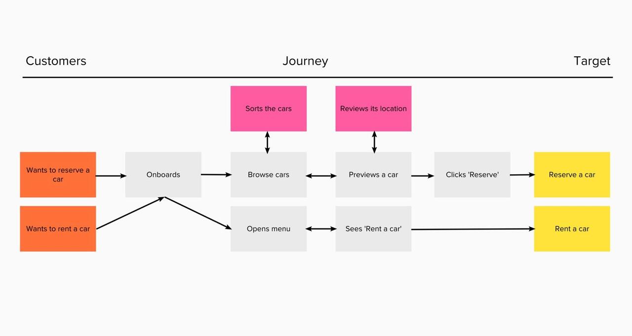 3_Map์ ๋ง๋ ๋ค. > ์ผ์ชฝ์๋ '๊ณ ๊ฐ๊ณผ Key Player'๋ฅผ ์ ๊ณ ์ค๋ฅธ์ชฝ ๋์๋ ์ฐ๋ฆฌ์ ์ต์ข goal์ ์ ๋๋ค. ๊ทธ๋ฆฌ๊ณ ๊ทธ ์ฌ์ด์ ์ ์ ์์ ์ํธ์์ฉ ํ๋ก์ฐ ์ฐจํธ๋ฅผ ๊ทธ๋ ค๋ณธ๋ค. ๋ฐ๋ก ์ด๋ ๊ฒ.
